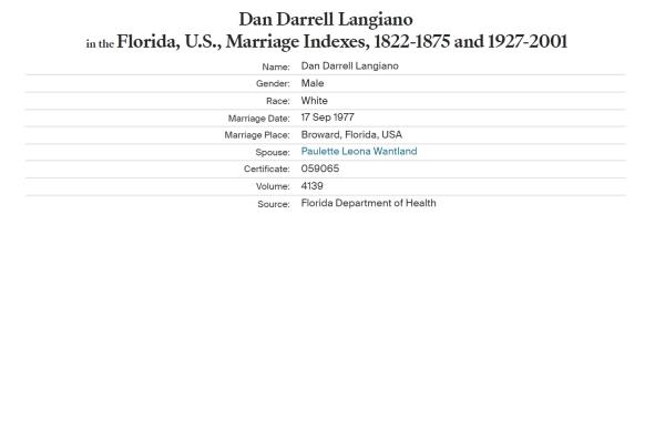 Dan "Doc" Langiano were married on September 17, 1977 in Broward, Florida, USA. She died on April 13, 2005, at age 46, in Dade, Georgia, USA.