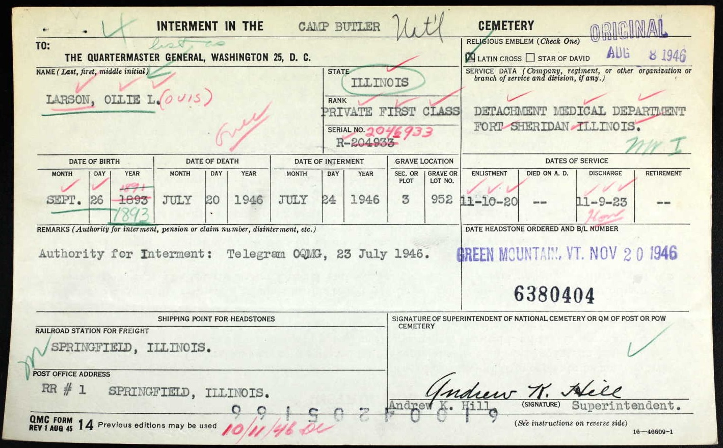 Gladys Perry were married. He died on March 11, 1958, at age 31, in Illinois, USA. He was buried in Camp Butler National Cemetery, Springfield, Illinois.