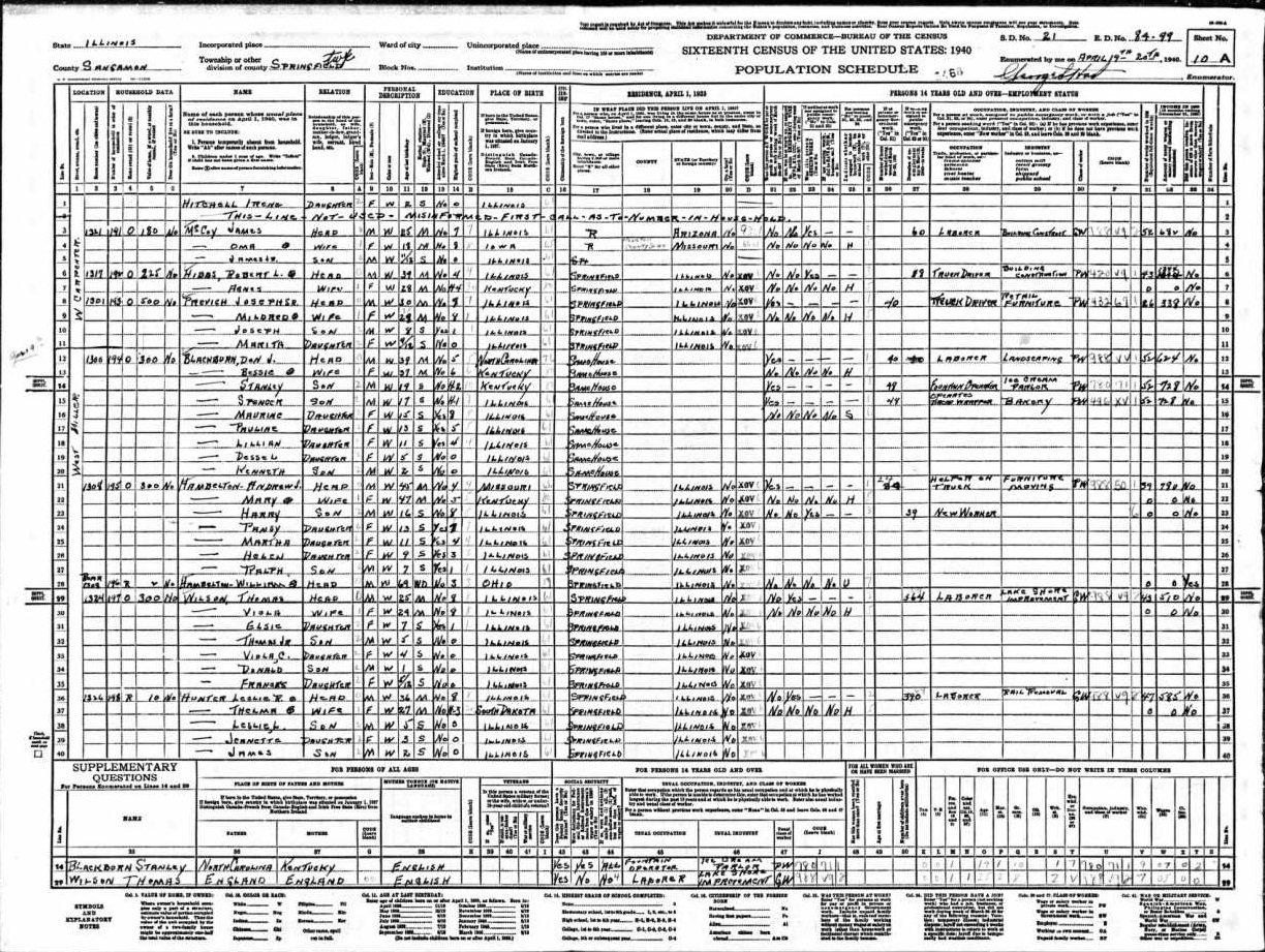 Wilson Family 1940 Federal Census Illinois, Lines 29-35