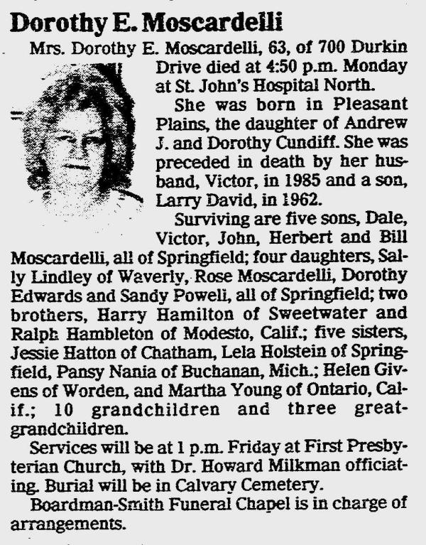 Victor Moscardelli were married. She died on May 6, 1985, at age 63, in Springfield, Sangamon, Illinois, USA. She was buried in Calvary Cemetery, Springfield, Illinois.