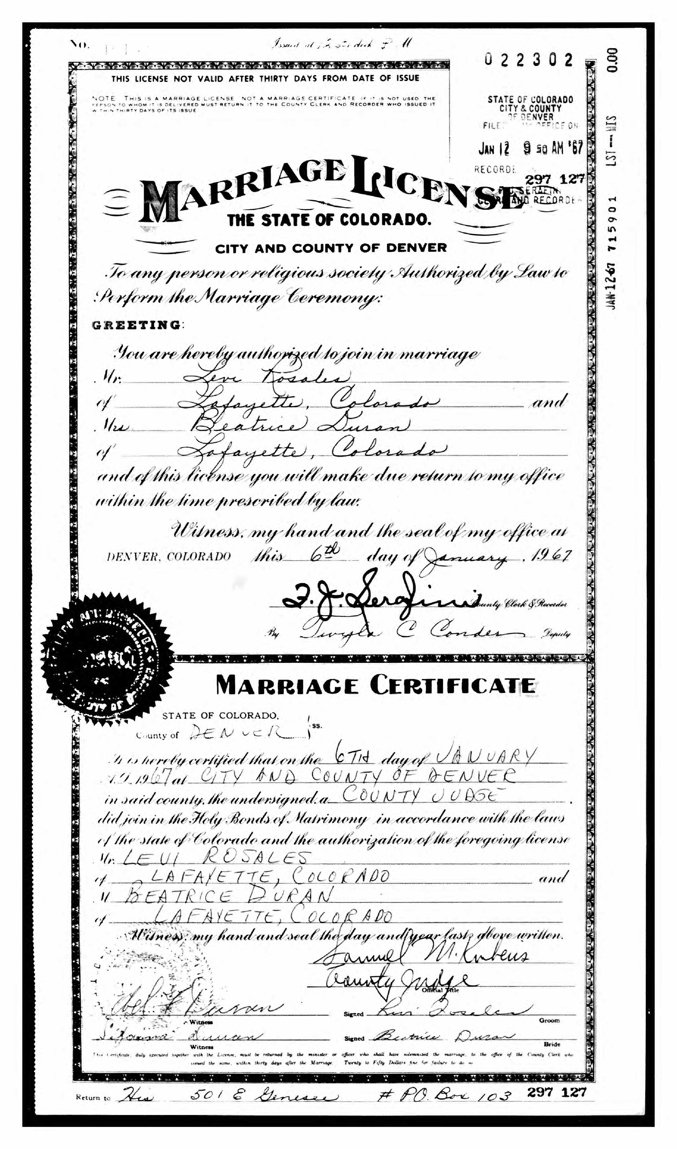 Levi Jose Rosales were married on January 6, 1967 in Denver, Colorado, USA. She died.