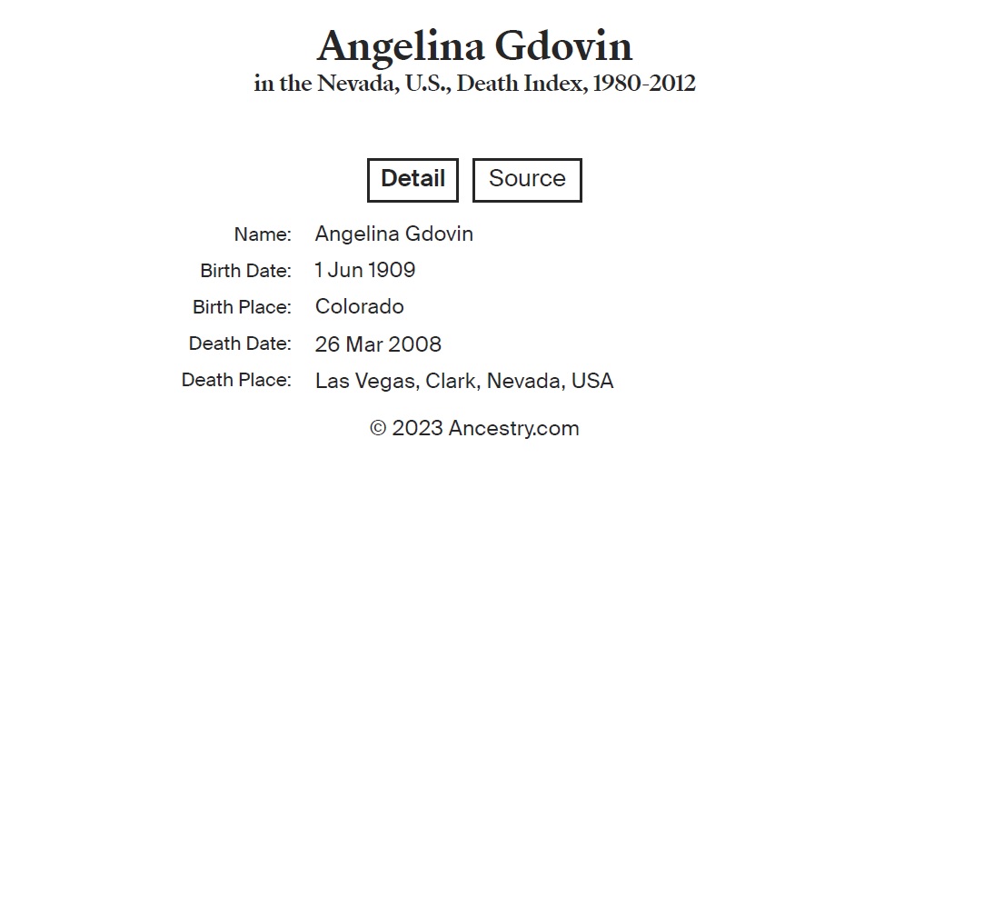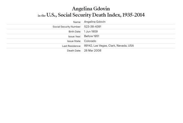 James Powell Gdovin were married on June 16, 1935 in Denver, Colorado, USA. She died on March 26, 2008, at age 98, in Las Vegas, Clark, Nevada, USA.