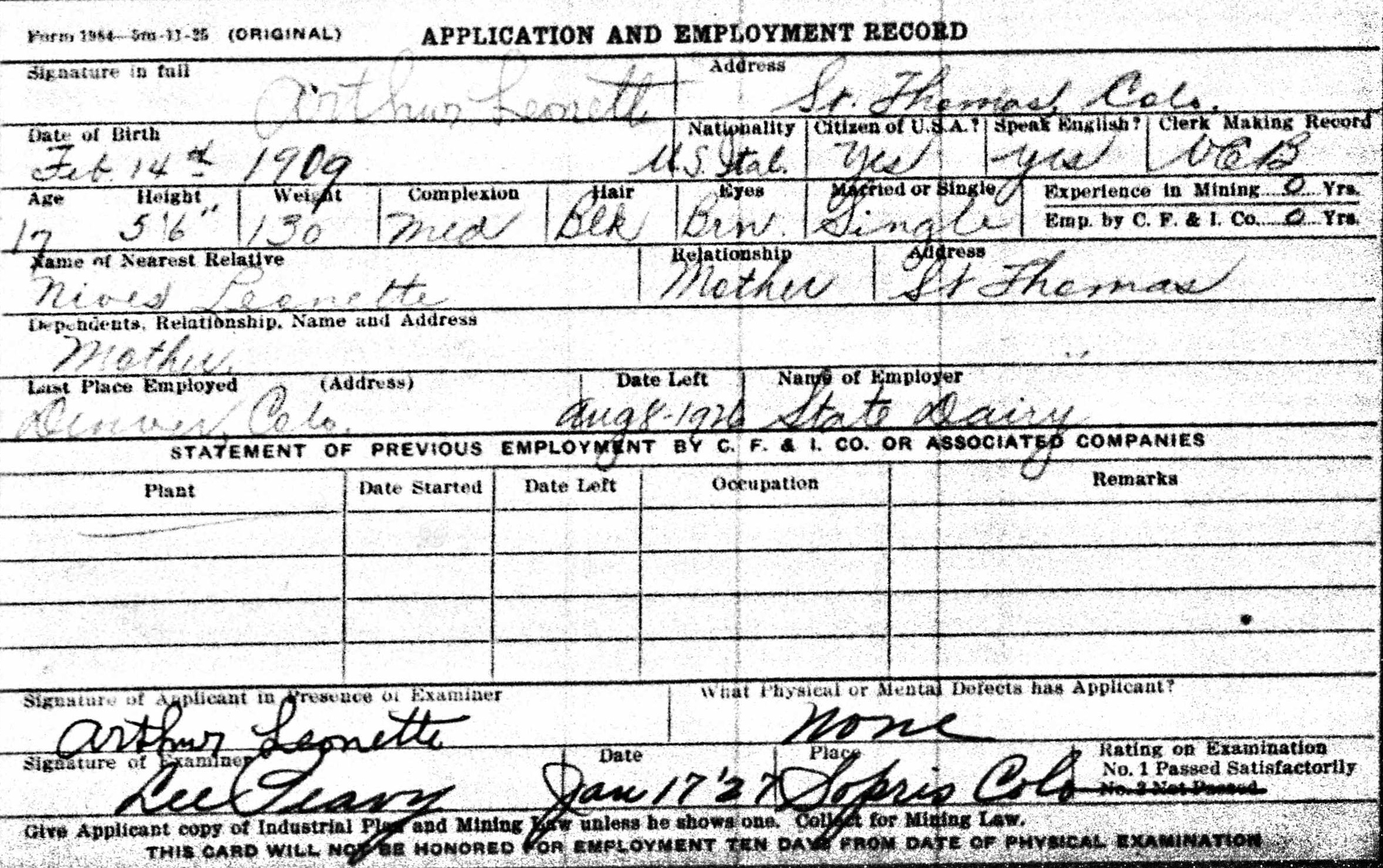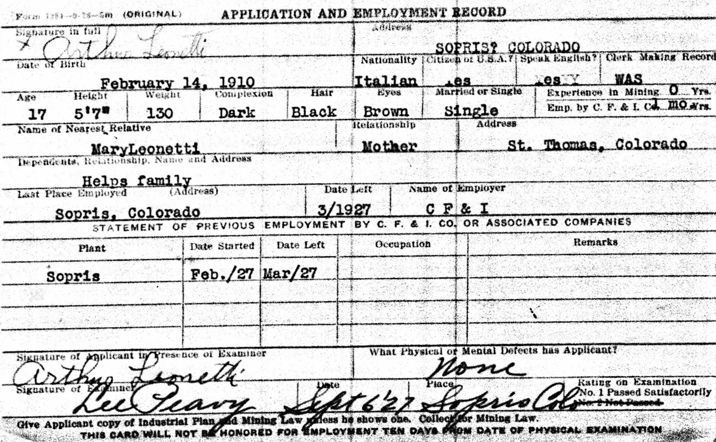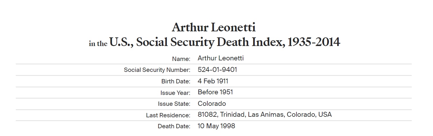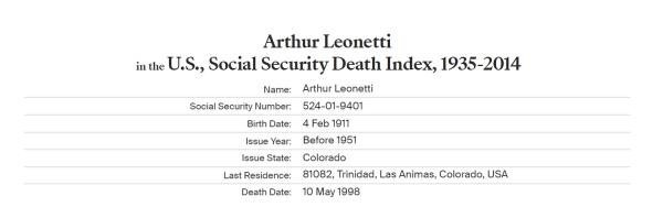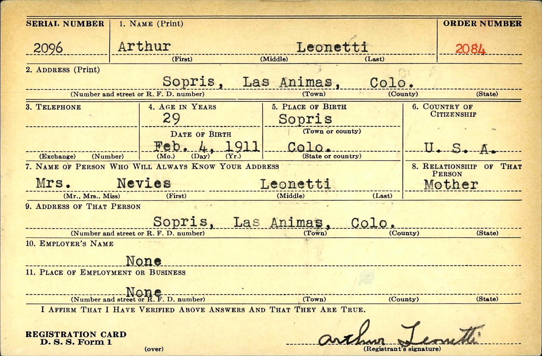 Arduino "Arthur Joe" Leonetti was born on February 14, 1911 in Sopris, Las Animas, Colorado, USA. He and