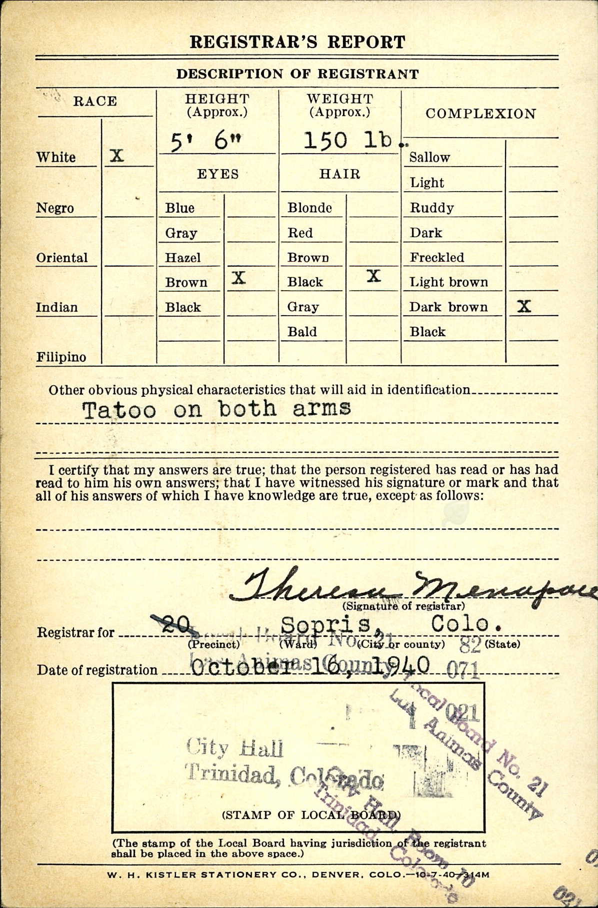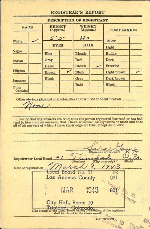 Lola S. were married on February 9, 1949 in Trinidad, Las Animas, Colorado, USA. He died on May 10, 1998, at age 87, in Trinidad, Las Animas, Colorado, USA. He was buried in Catholic Cemetery, Trinidad, Colorado.