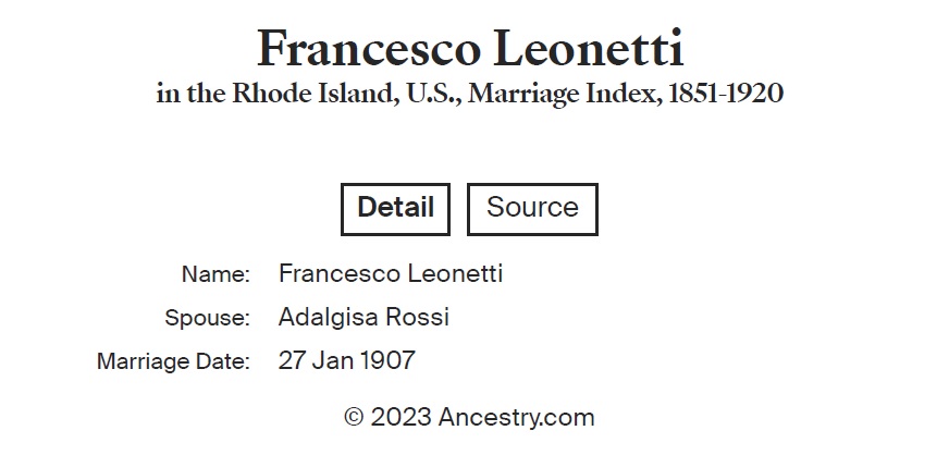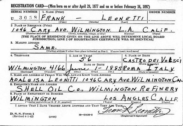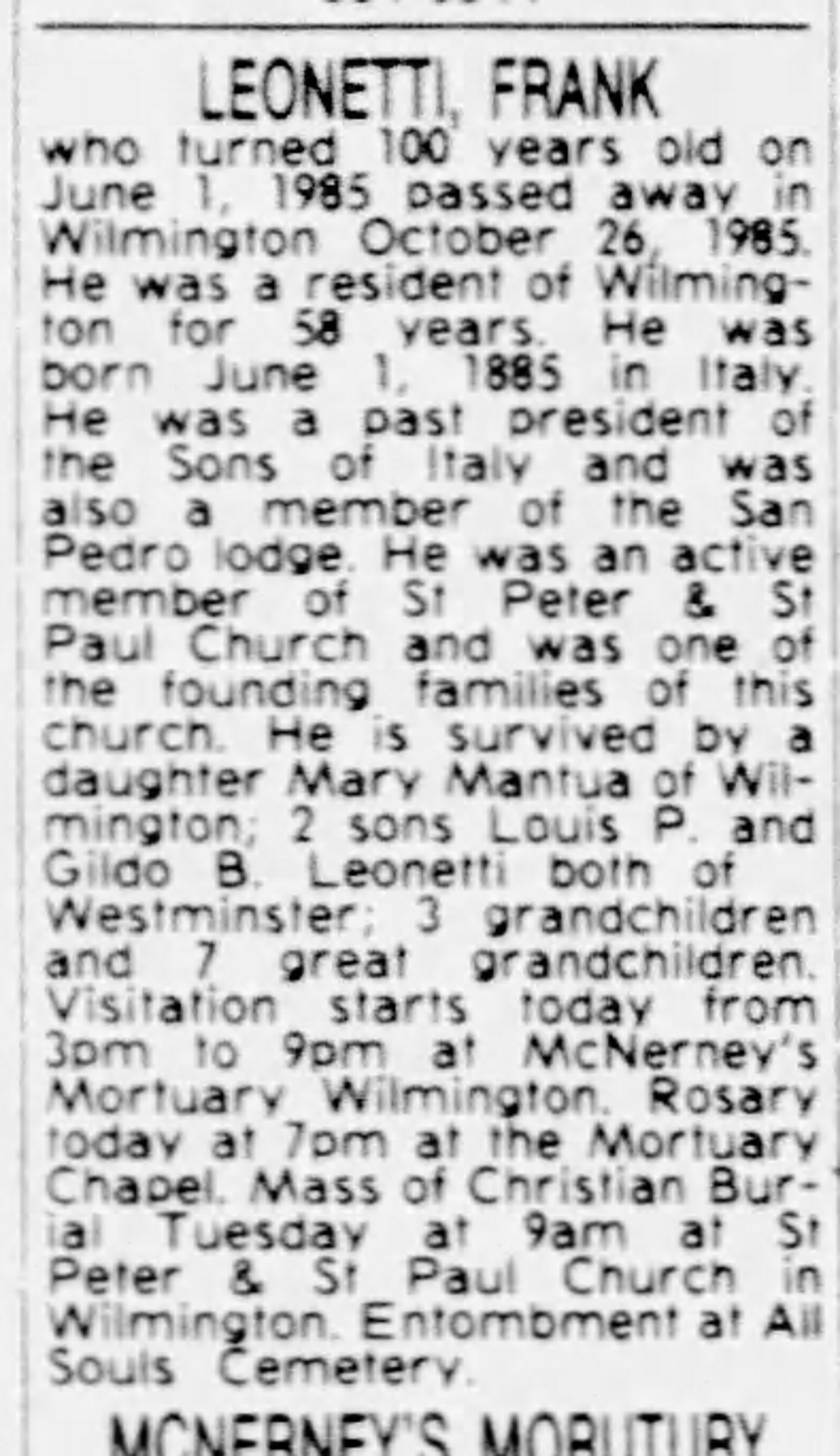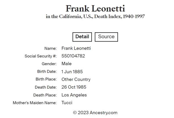 Francesco "Frank" Leonetti was born on June 1, 1885 in Castro dei Volsci, Frosinone, Lazio, Italy. He and