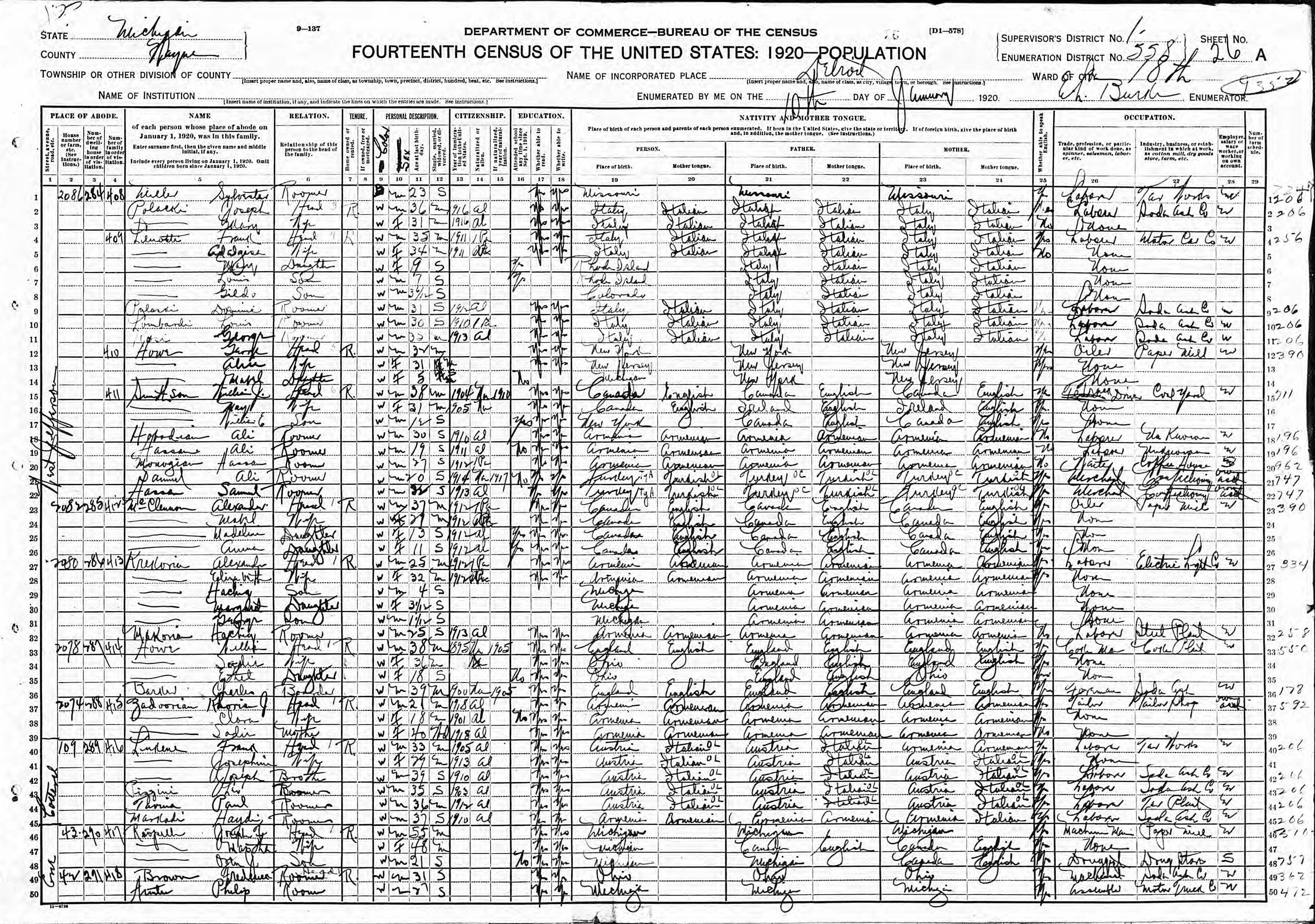 Leonetti Family 1920 Federal Census Michigan, Lines 4-9