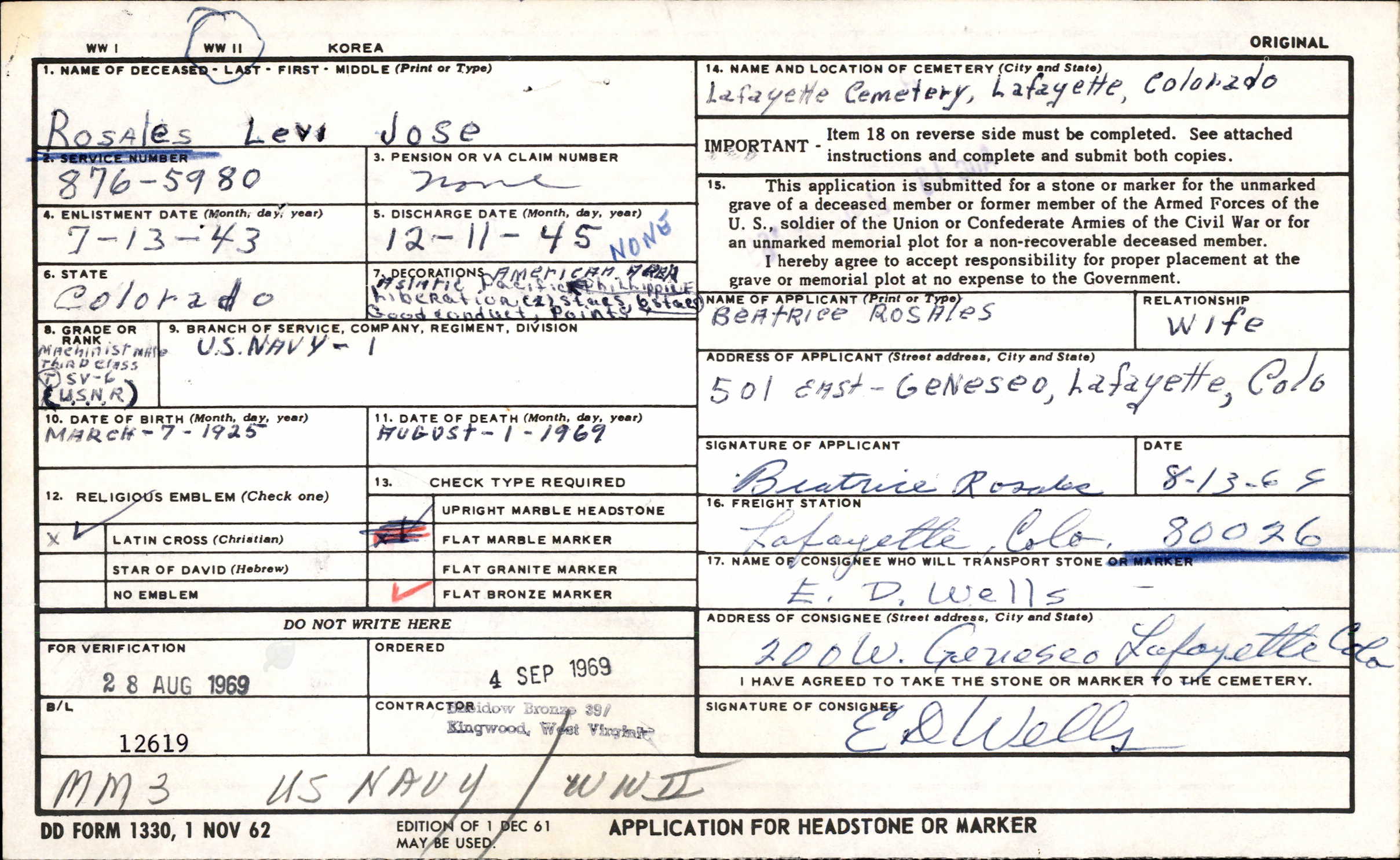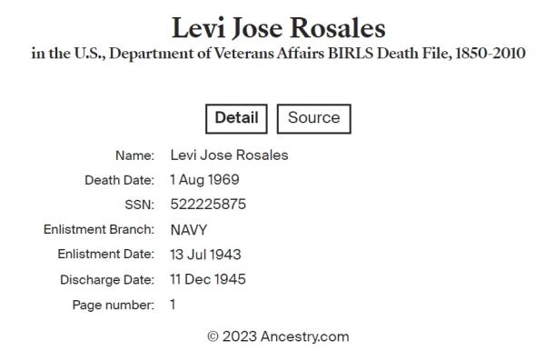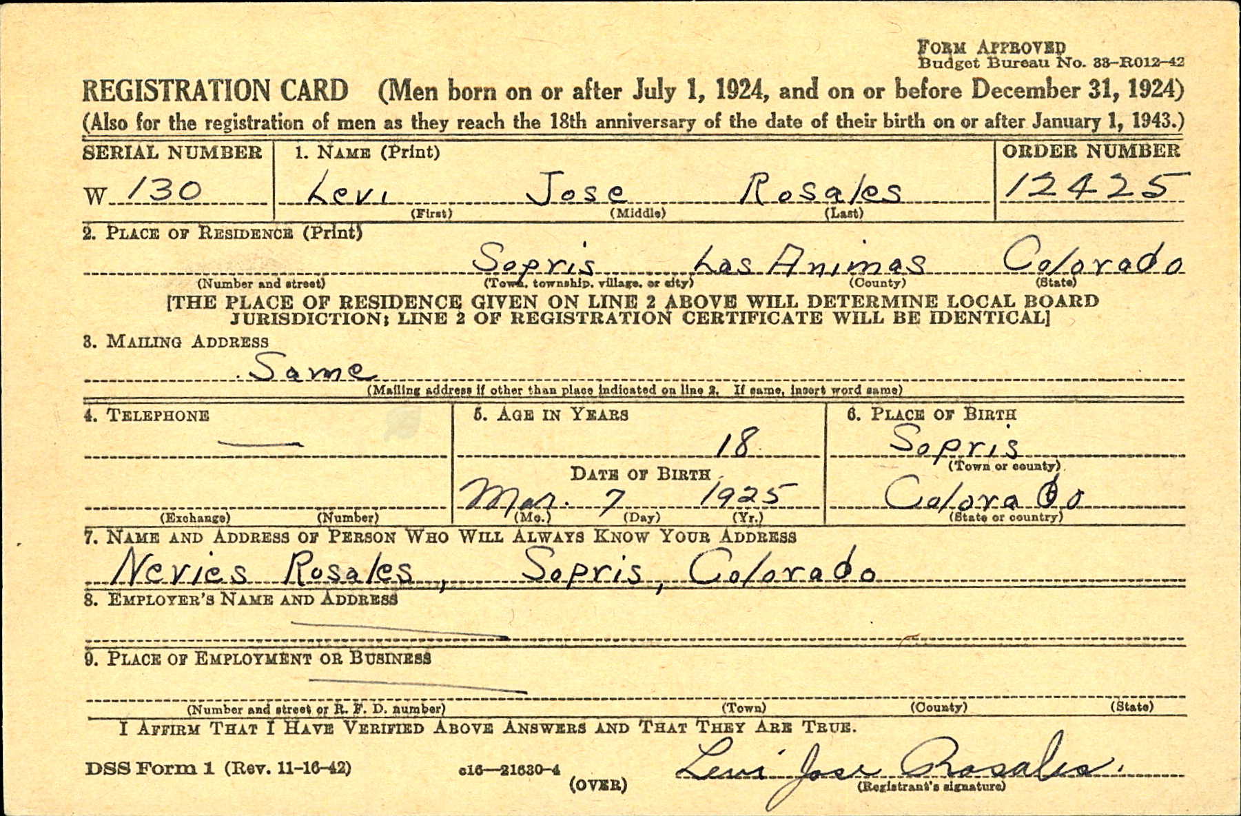 Levi Jose Rosales was born on March 7, 1925 in Sopris, Las Animas, Colorado, USA. He and
