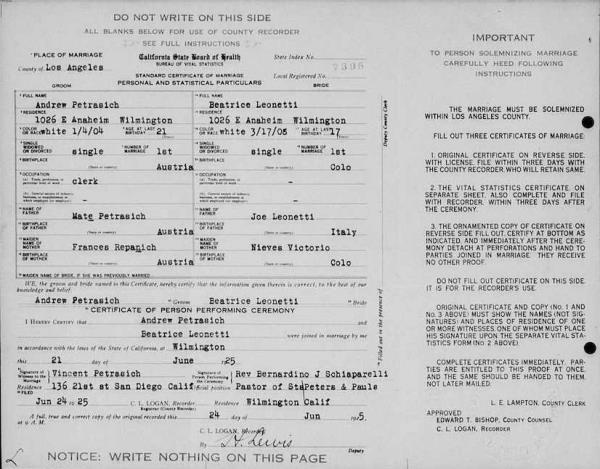 Beatrice Leonetti were married on June 24, 1925 in Los Angeles, California, USA. He died.
