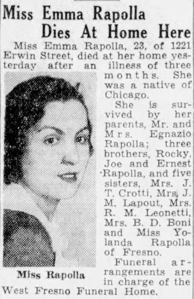 Emma Rapolla was born in 1912 in Illinois, USA. She died in 1935, at age ~23, in Fresno, Fresno, California, USA.