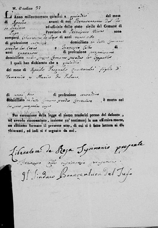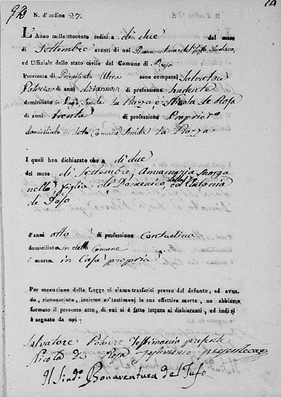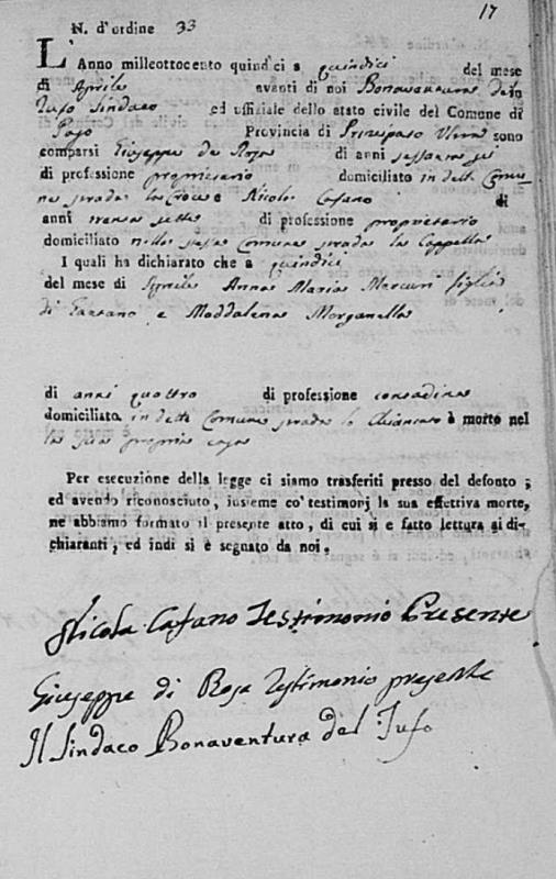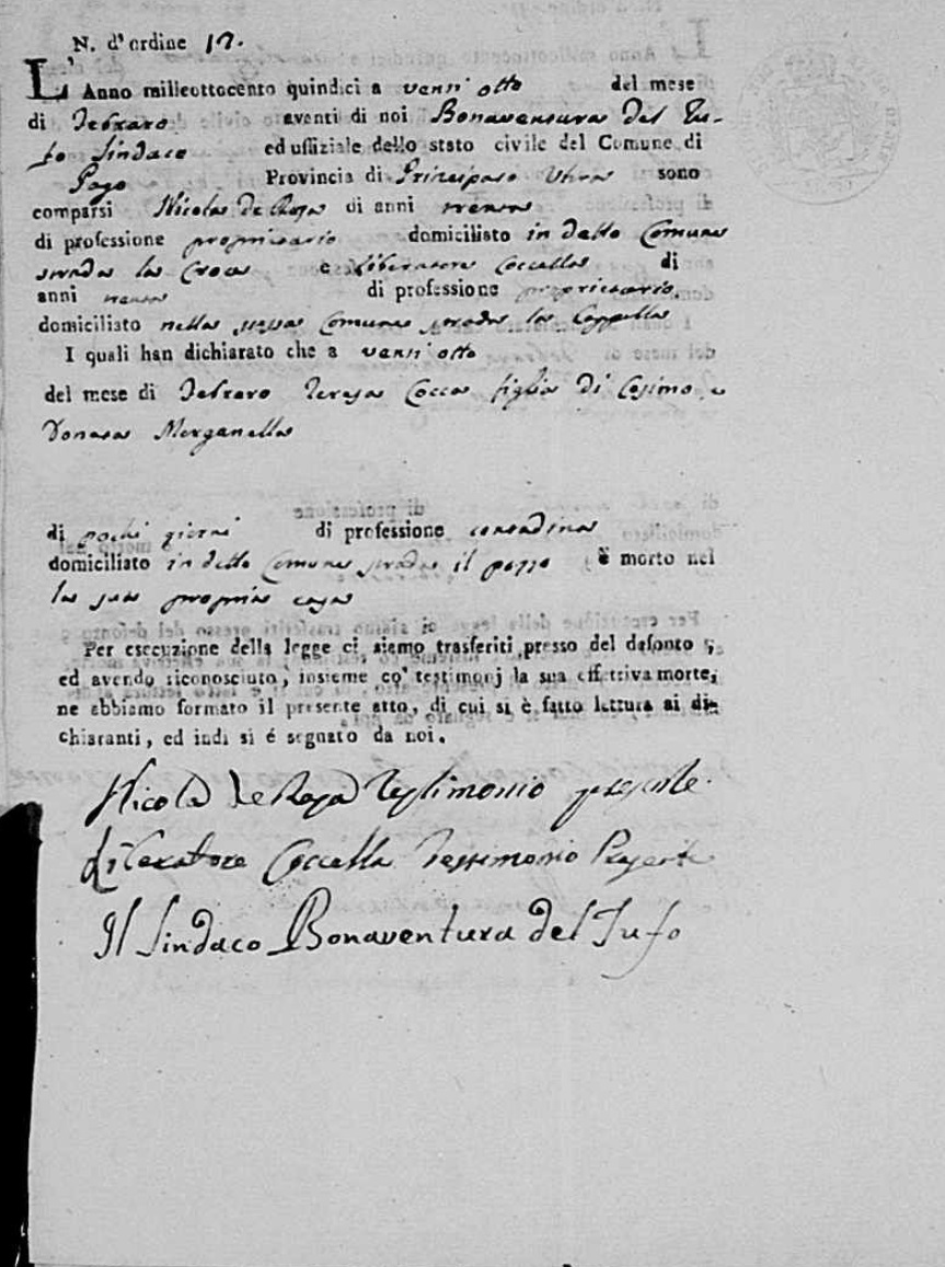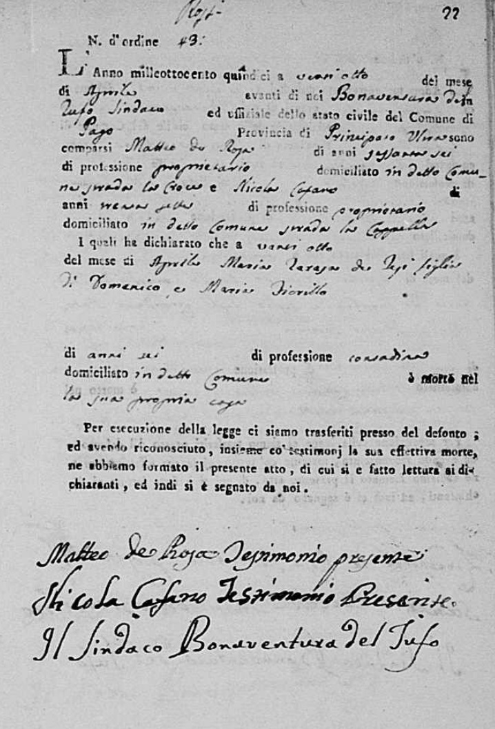 Lucia De Ieso were married. He died on May 28, 1817, at age ~33, in Pago Veiano, Benevento, Campania, Italy.