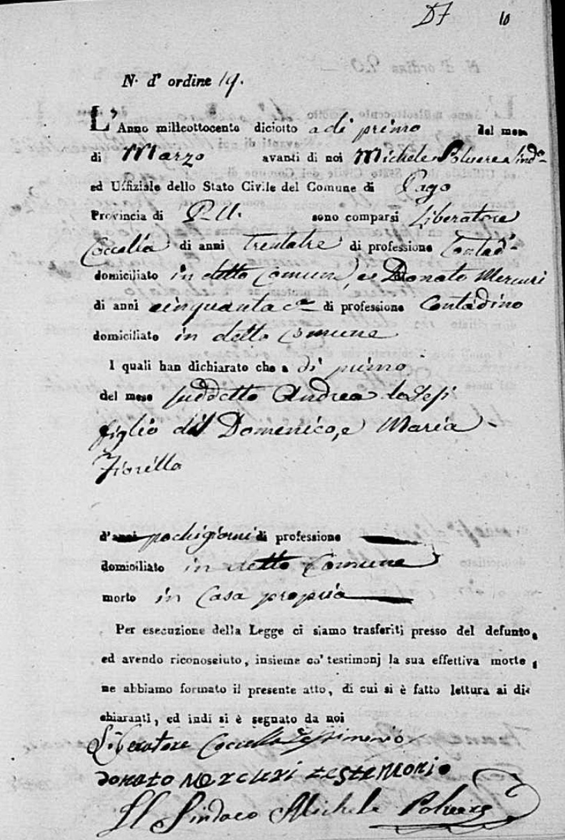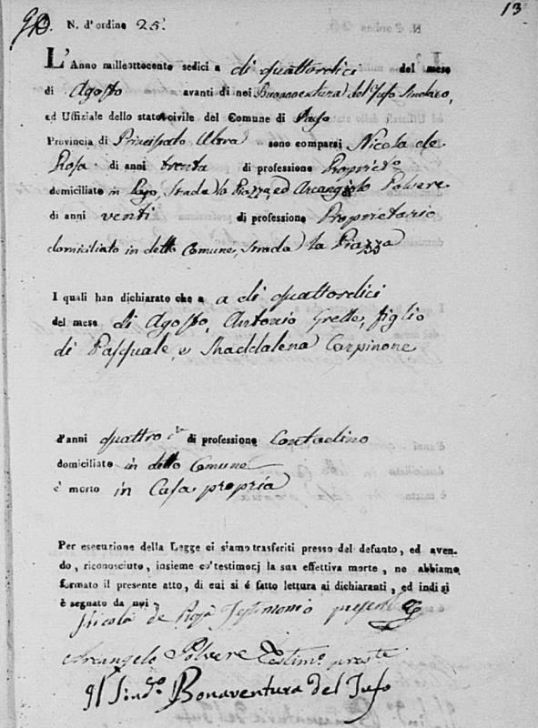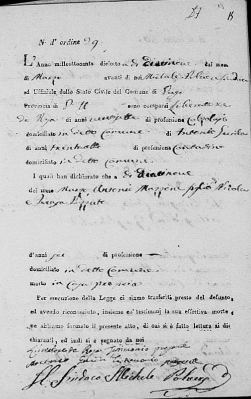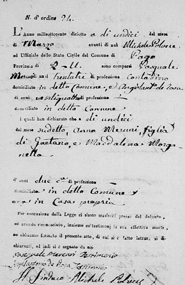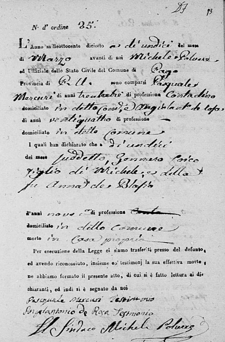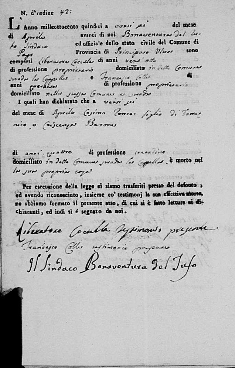 Lucia De Ieso were married. He died on May 28, 1817, at age ~33, in Pago Veiano, Benevento, Campania, Italy.
