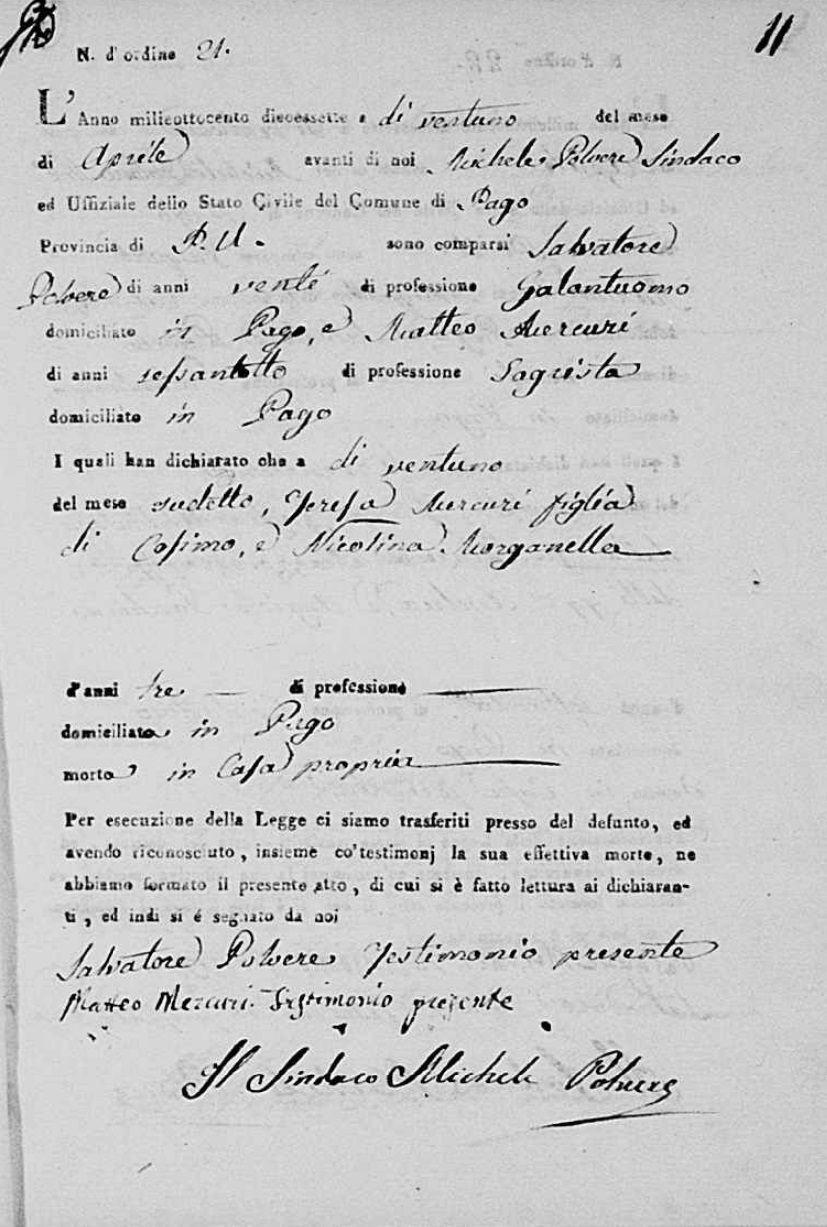 Teresa Mercuri was born in 1813 in Pago Veiano, Benevento, Campania, Italy. She died on April 21, 1817, at age ~4, in Pago Veiano, Benevento, Campania, Italy.
