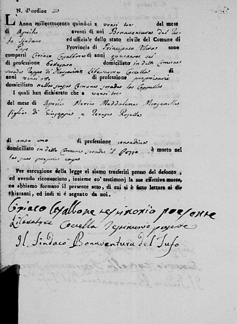 Maria Maddalena Morganella was born in 1814 in Pago Veiano, Benevento, Campania, Italy. She died on April 23, 1815, at age ~1, in Pago Veiano, Benevento, Campania, Italy.
