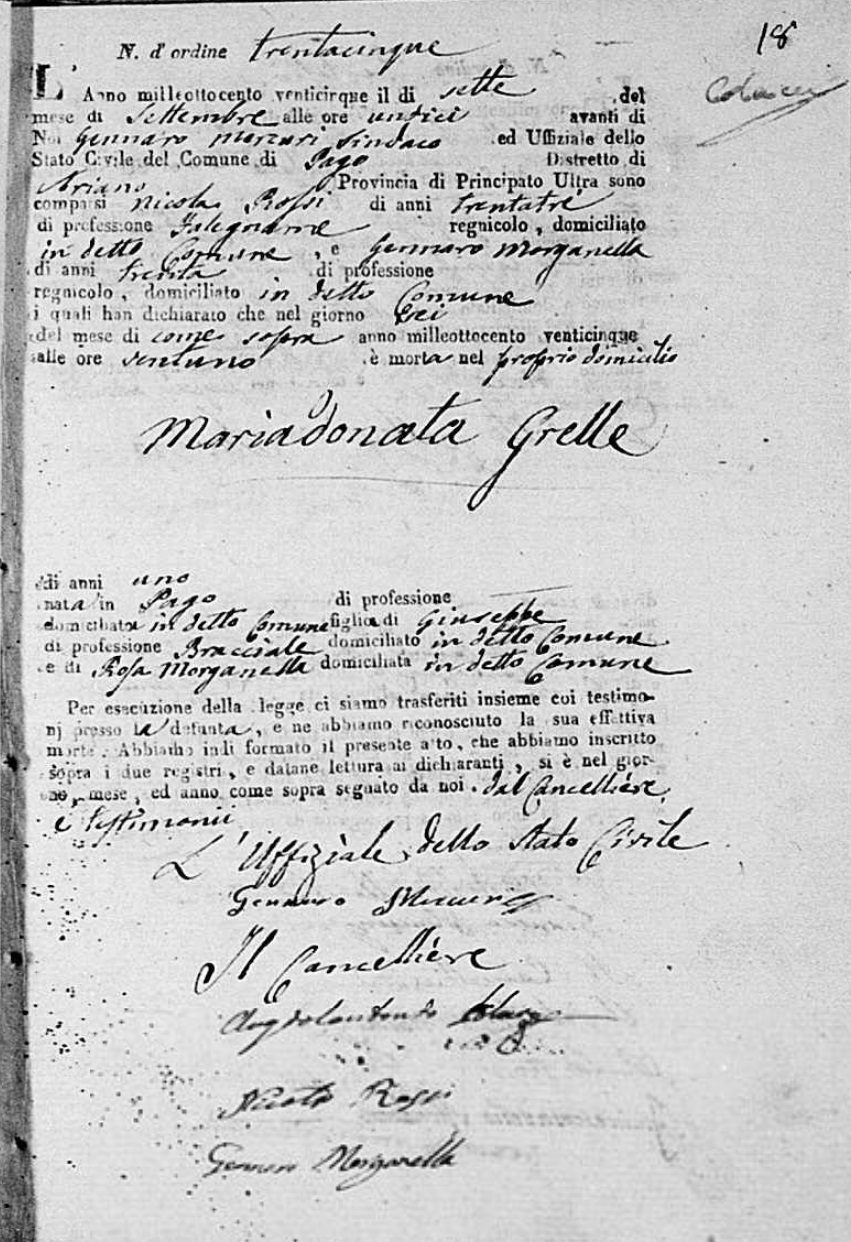 Maria Donata Grelle was born in 1824 in Pago Veiano, Benevento, Campania, Italy. She died on September 6, 1825, at age ~1, in Pago Veiano, Benevento, Campania, Italy.