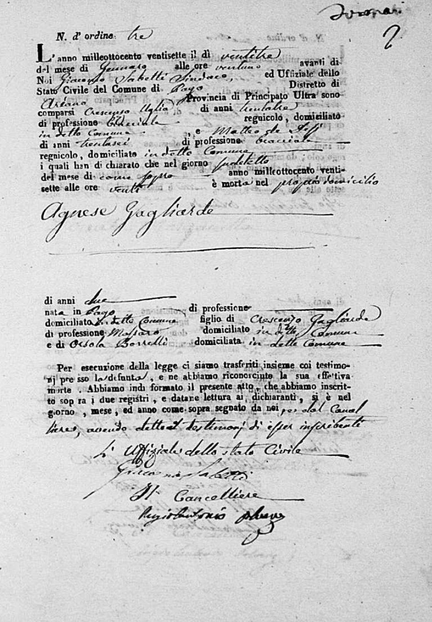 Agnese Gagliardi was born in 1825 in Pago Veiano, Benevento, Campania, Italy. She died on January 23, 1827, at age ~2, in Pago Veiano, Benevento, Campania, Italy.