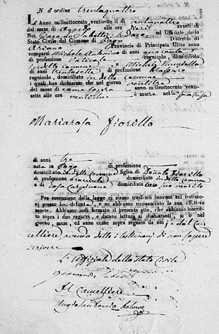 Mariarosa Fiorillo was born in 1824 in Pago Veiano, Benevento, Campania, Italy. She died on August 24, 1827, at age ~3, in Pago Veiano, Benevento, Campania, Italy.