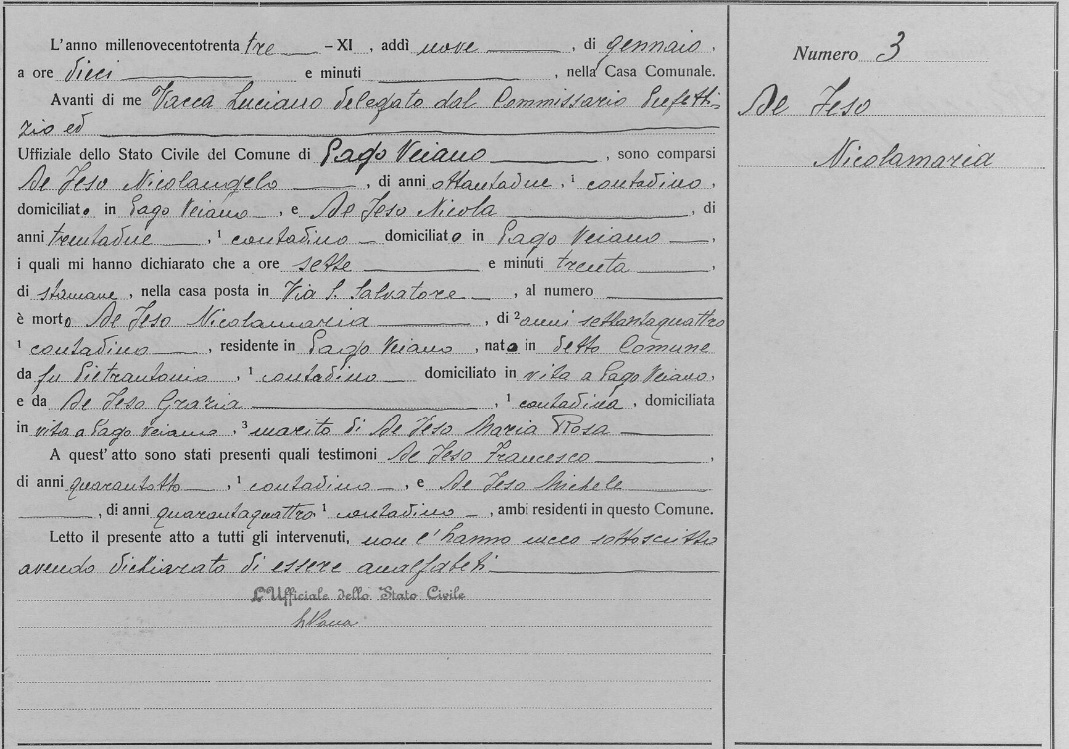 Maria Rosa De Ieso were married. He died on January 9, 1933, at age ~74, in Pago Veiano, Benevento, Campania, Italy.