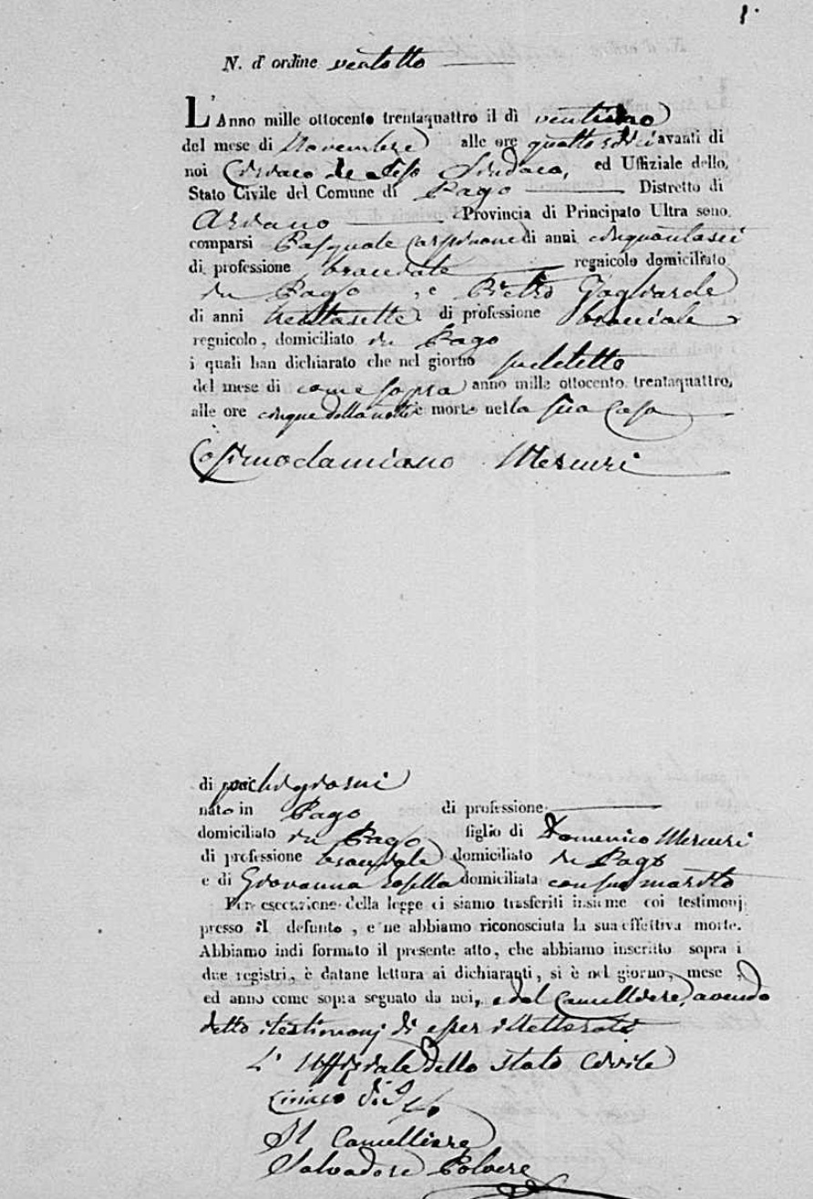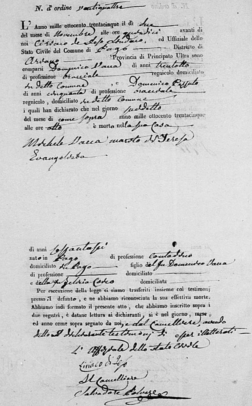 Teresa Evangelista were married. He died on November 2, 1835, at age ~66, in Pago Veiano, Benevento, Campania, Italy.