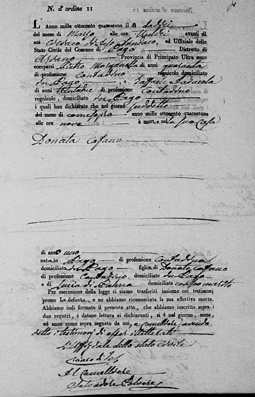 Donata Cafano was born in 1840 in Pago Veiano, Benevento, Campania, Italy. She died on March 12, 1841, at age ~1, in Pago Veiano, Benevento, Campania, Italy.