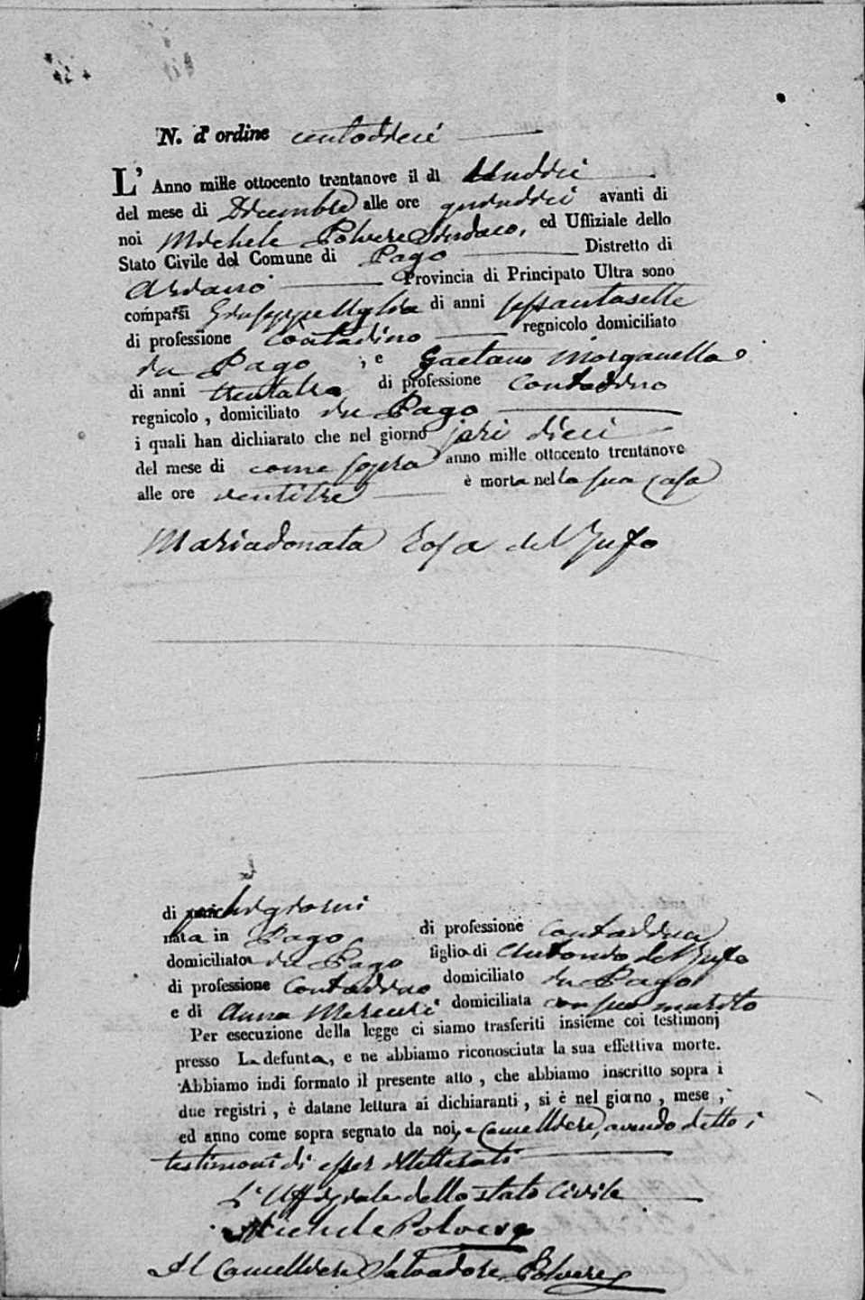 Mariadonata Del Tufo was born in 1838 in Pago Veiano, Benevento, Campania, Italy. She died on December 11, 1838, at age ~0, in Pago Veiano, Benevento, Campania, Italy.