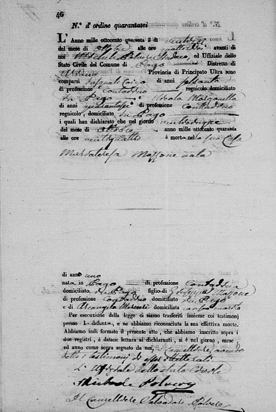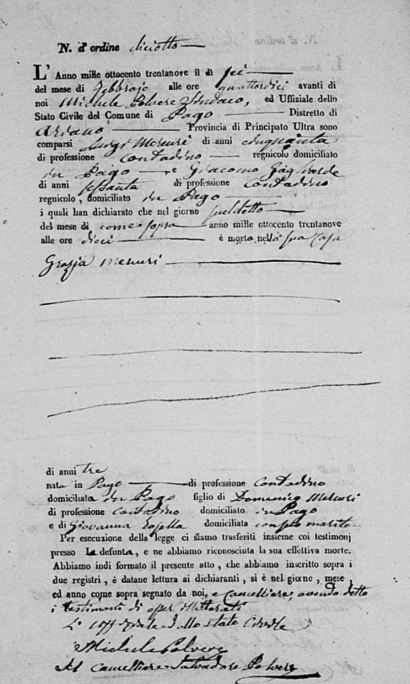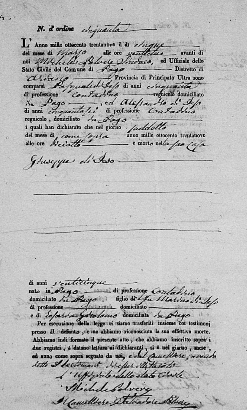 Rita De Ieso were married. He died on January 15, 1841, at age ~64, in Pago Veiano, Benevento, Campania, Italy.