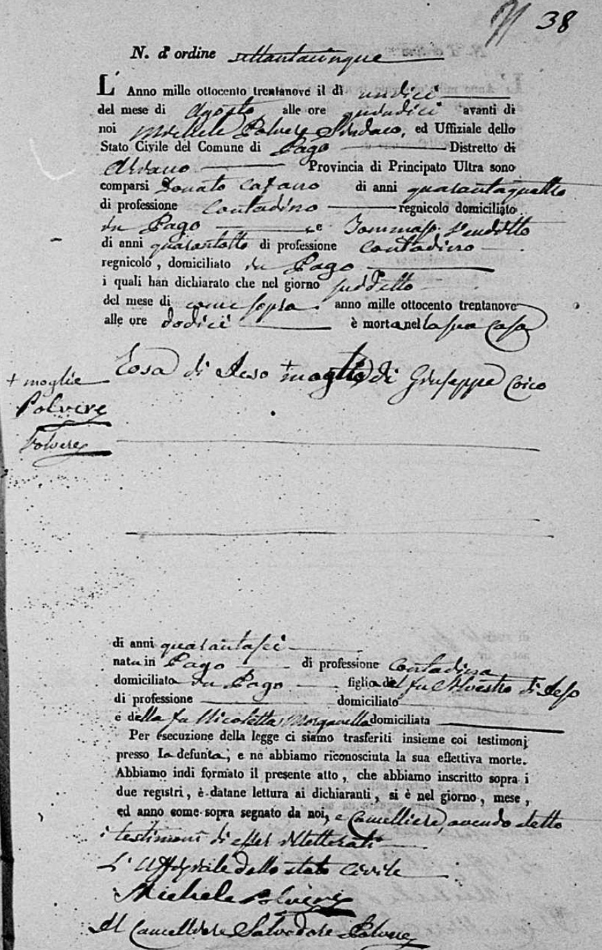 Carmina Polvere were married. He died on June 15, 1839, at age ~48, in Pago Veiano, Benevento, Campania, Italy.