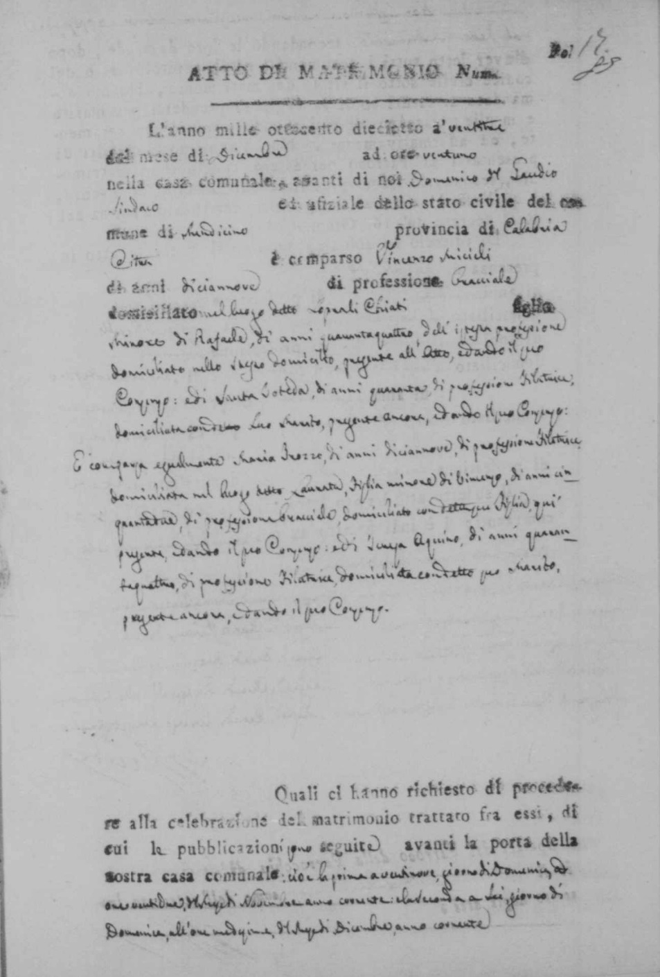 Vincenzo Micieli was born in 1799 in Mendicino, Cosenza, Calabria, Italy. He and