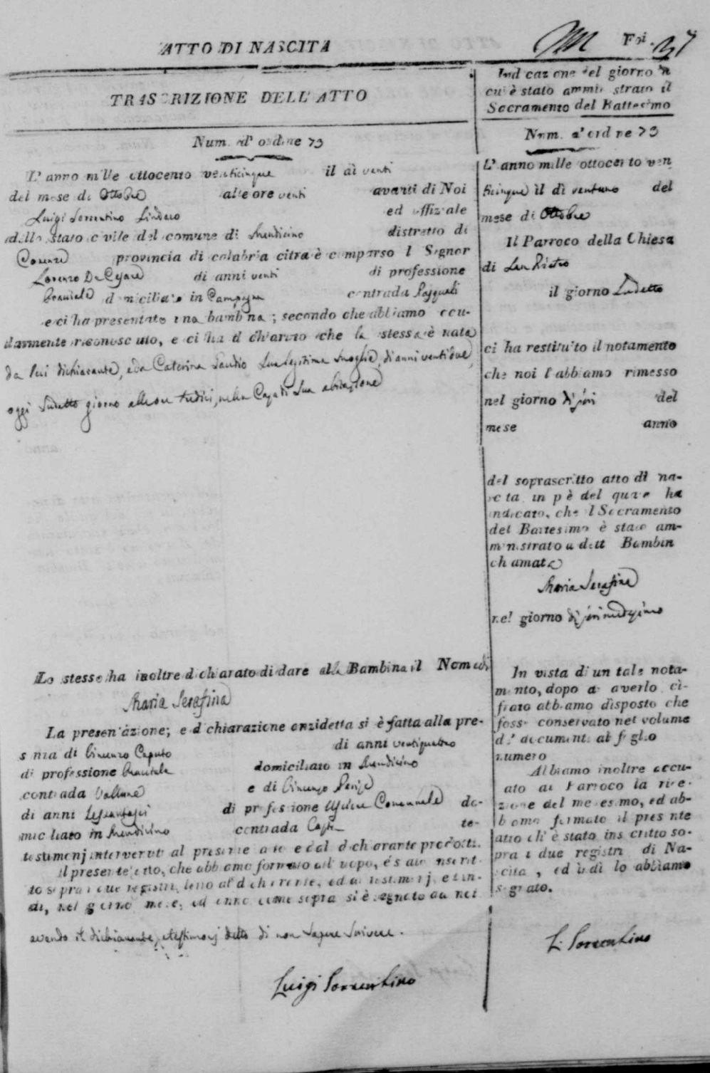 Maria Serafina De Cesare (De Cesaro) was born on October 20, 1825 in Mendicino, Cosenza, Calabria, Italy. She and