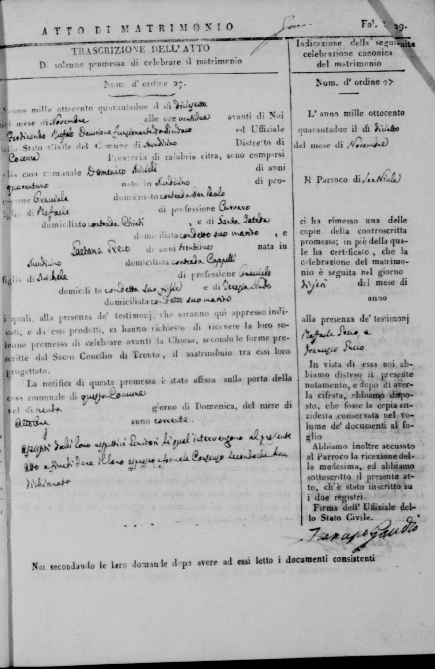 Serafino Reda were married on February 3, 1850 in Mendicino, Cosenza, Calabria, Italy. She died on November 24, 1902, at age ~84, in Mendicino, Cosenza, Calabria, Italy.