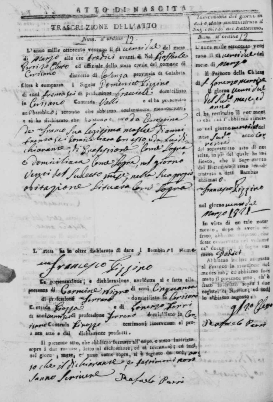 Francesco Pizzino was born on March 22, 1821 in Cerisano, Cosenza, Calabria, Italy. He and