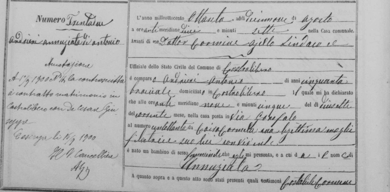 Gelsomina Costabile were married on September 26, 1875 in Castrolibero, Cosenza, Calabria, Italy. He died.