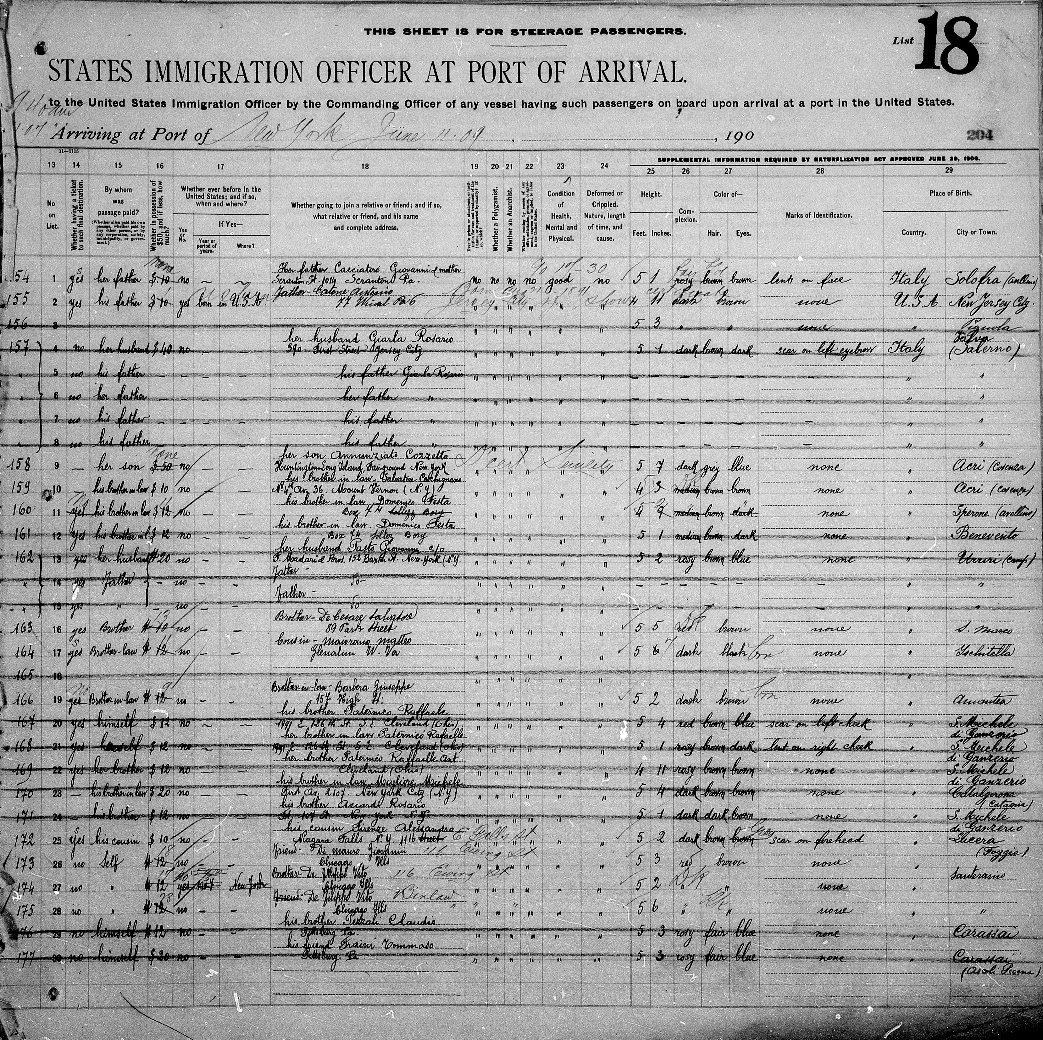 Bartolo De Cesare 1909 Ship Arrival Manifest, Line 16