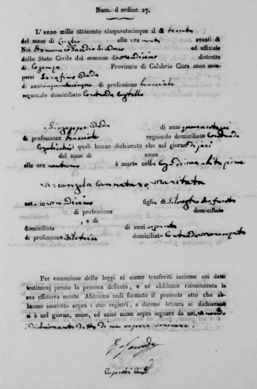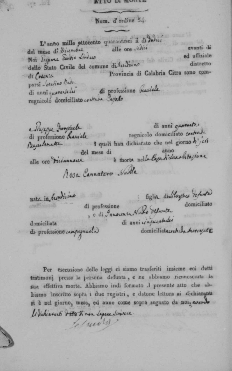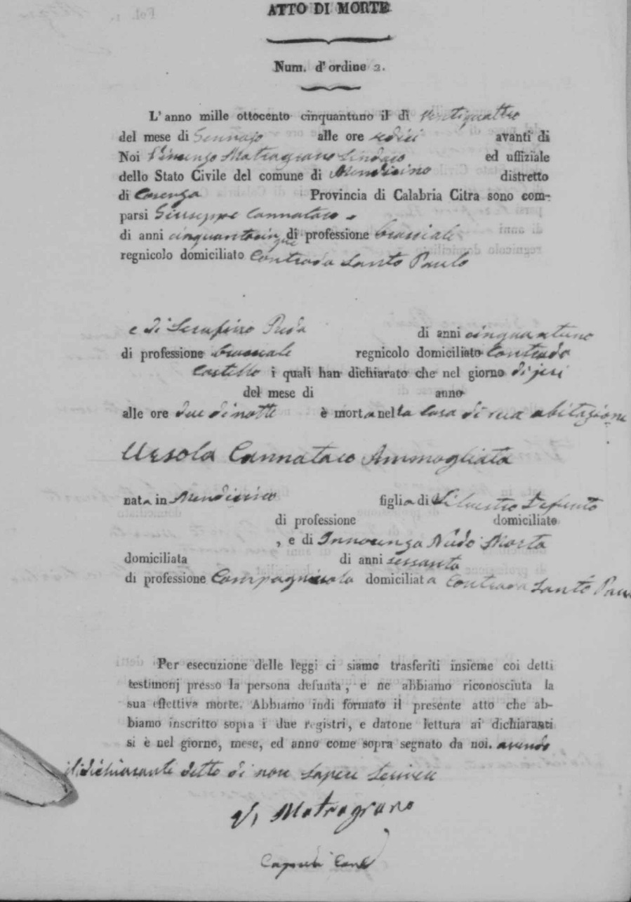 Teresa Connataro were married. He died on July 4, 1818, at age ~70, in Mendicino, Cosenza, Calabria, Italy.