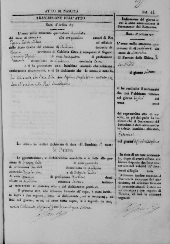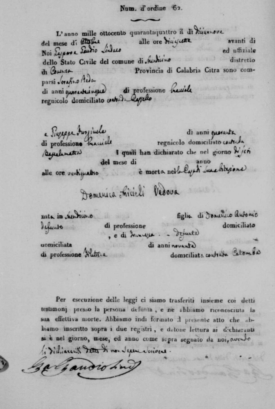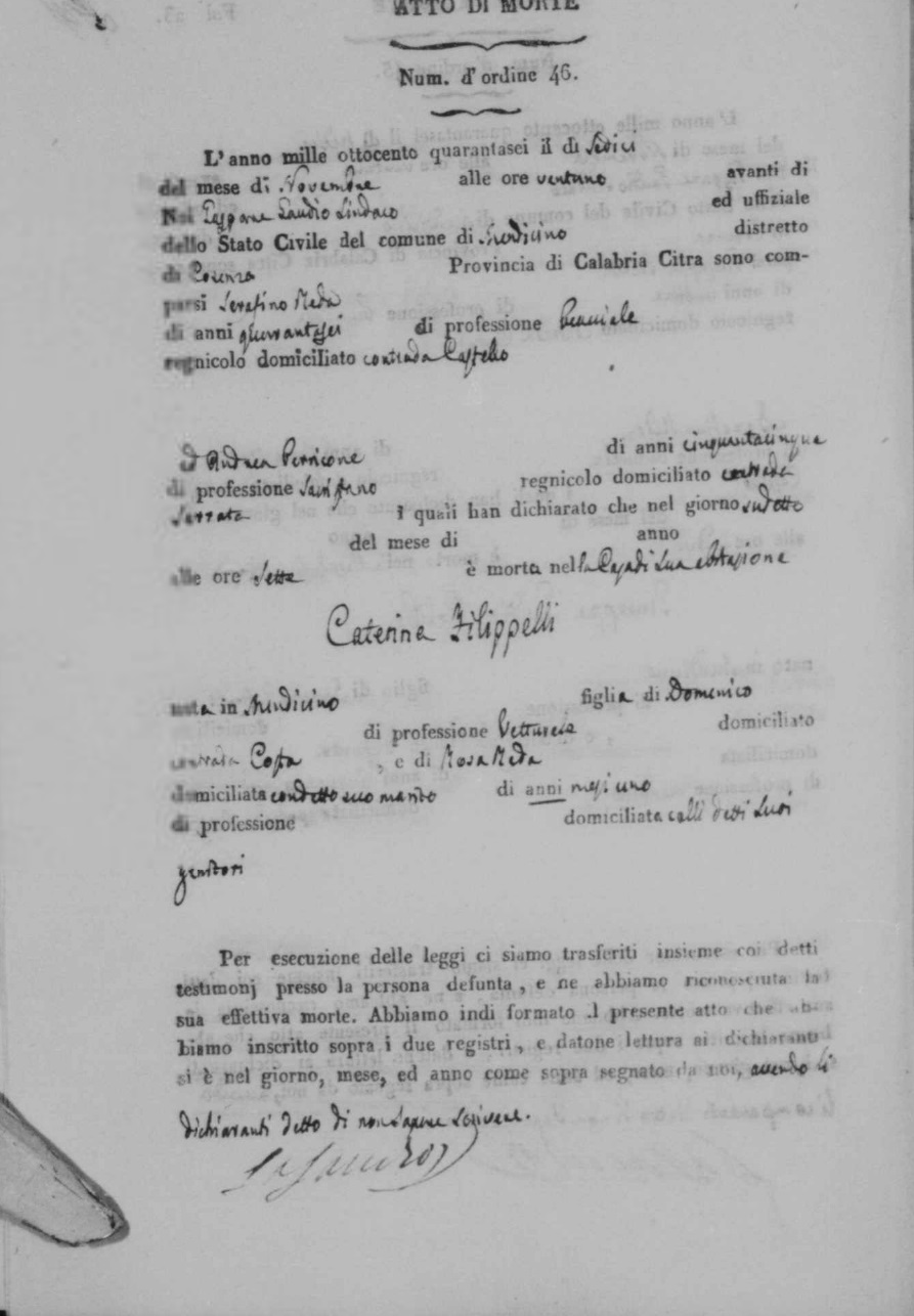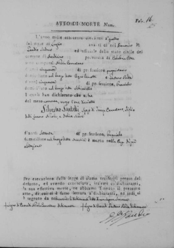 Teresa Connataro were married. He died on July 4, 1818, at age ~70, in Mendicino, Cosenza, Calabria, Italy.