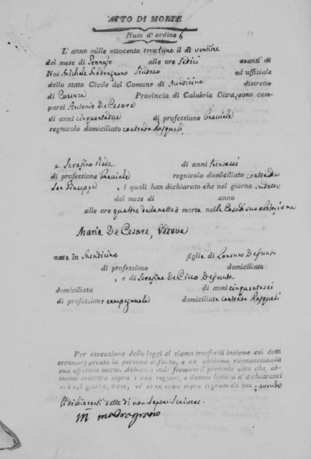 Maria De Cesare (De Cesaro) was born in 1775 in Mendicino, Cosenza, Calabria, Italy. She died on January 23, 1831, at age ~56, in Mendicino, Cosenza, Calabria, Italy.