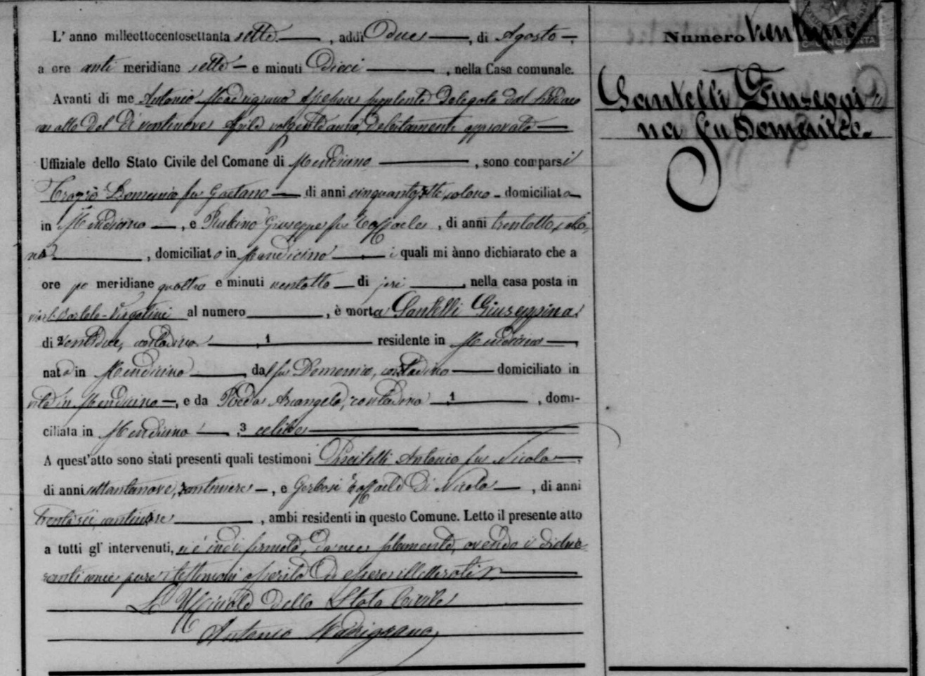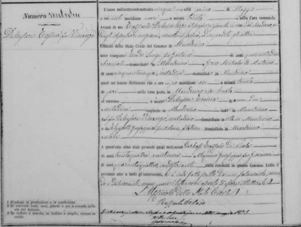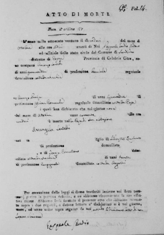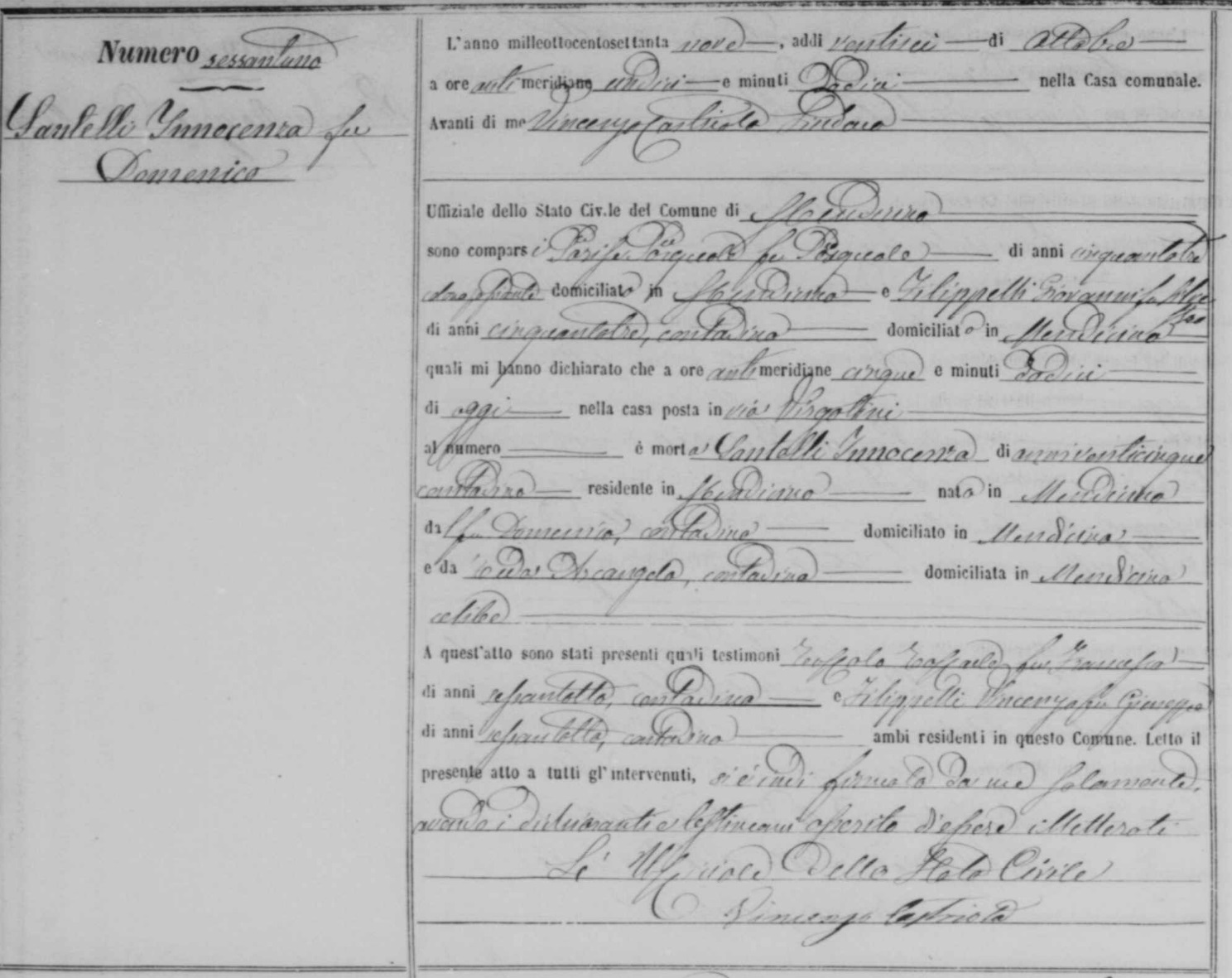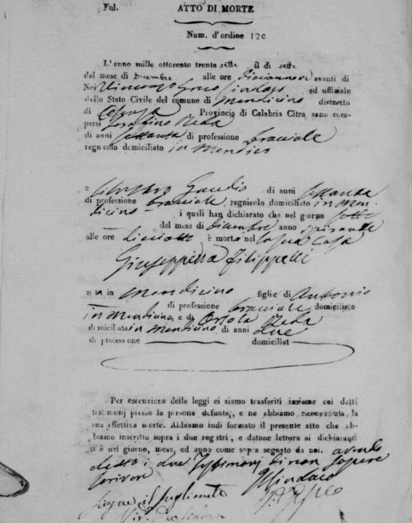 Giuseppina Filippelli were married. He died on November 20, 1874, at age 43, in Mendicino, Cosenza, Calabria, Italy.