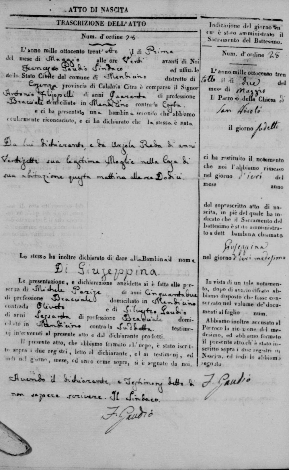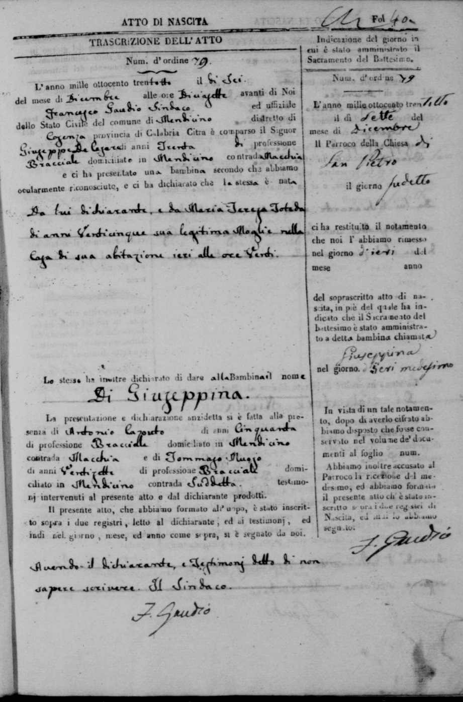 Giuseppina De Cesare (De Cesaro) was born on May 11, 1840 in Mendicino, Cosenza, Calabria, Italy. She and