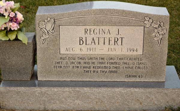 Clarence C. Blattert were married. She died on January 1, 1994, at age 82. She was buried in Trinity Lutheran Church Cemetery, Freistatt, Missouri.