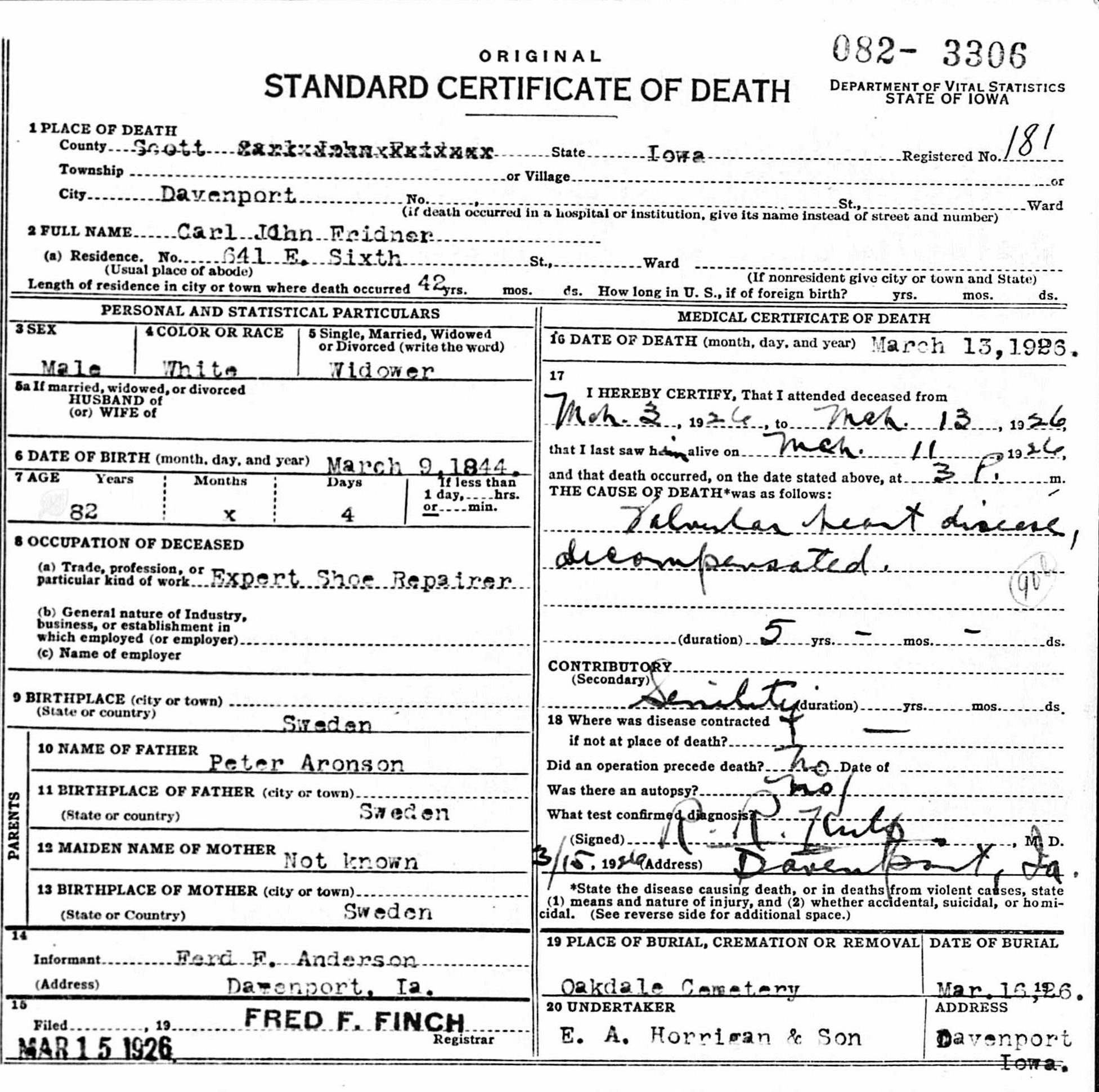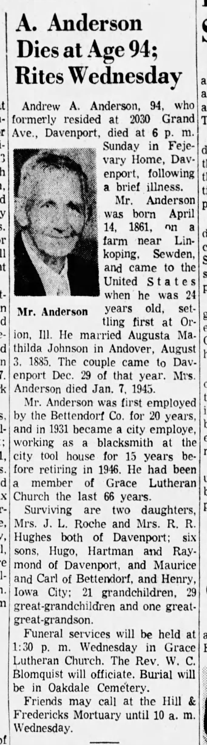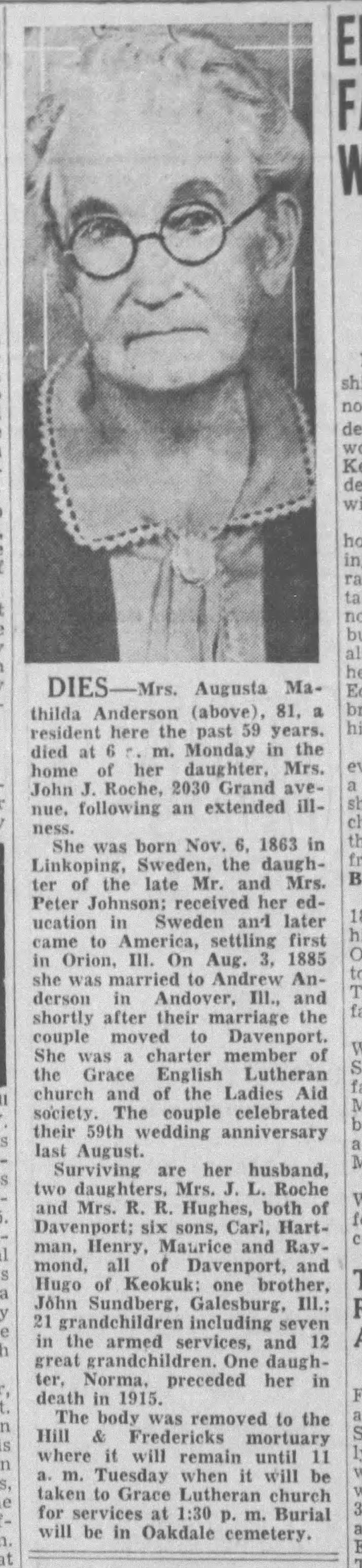 Augusta Mathilda Johansson were married on August 3, 1885 in Andover, Henry, Illinois, USA. He died on May 15, 1955, at age 94, in Davenport, Scott, Iowa, USA. He was buried in Oakdale Cemetery, Davenport, Iowa.