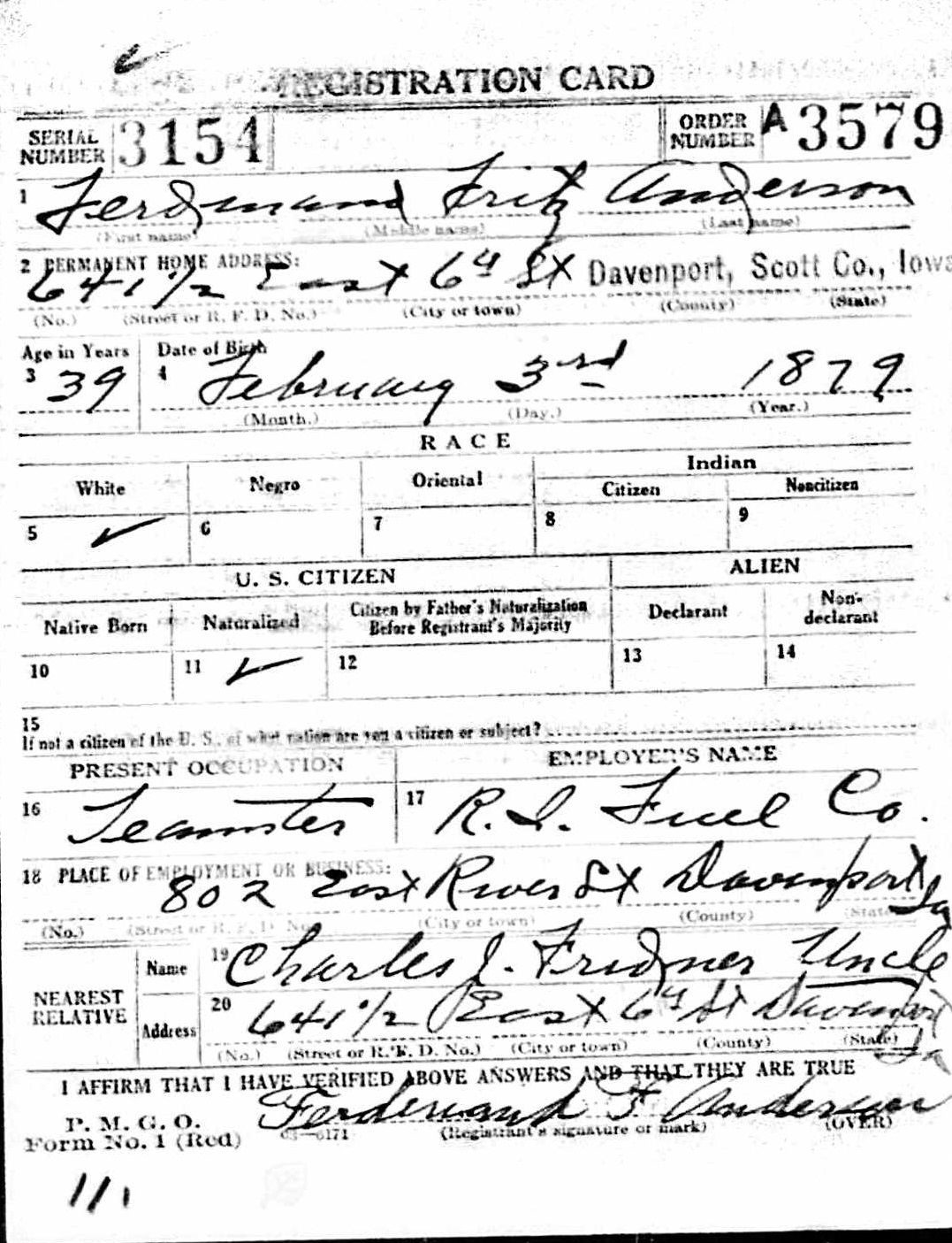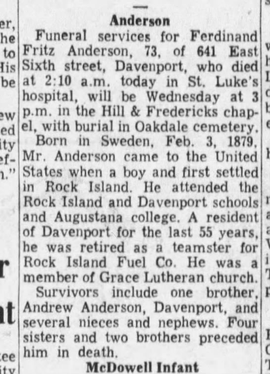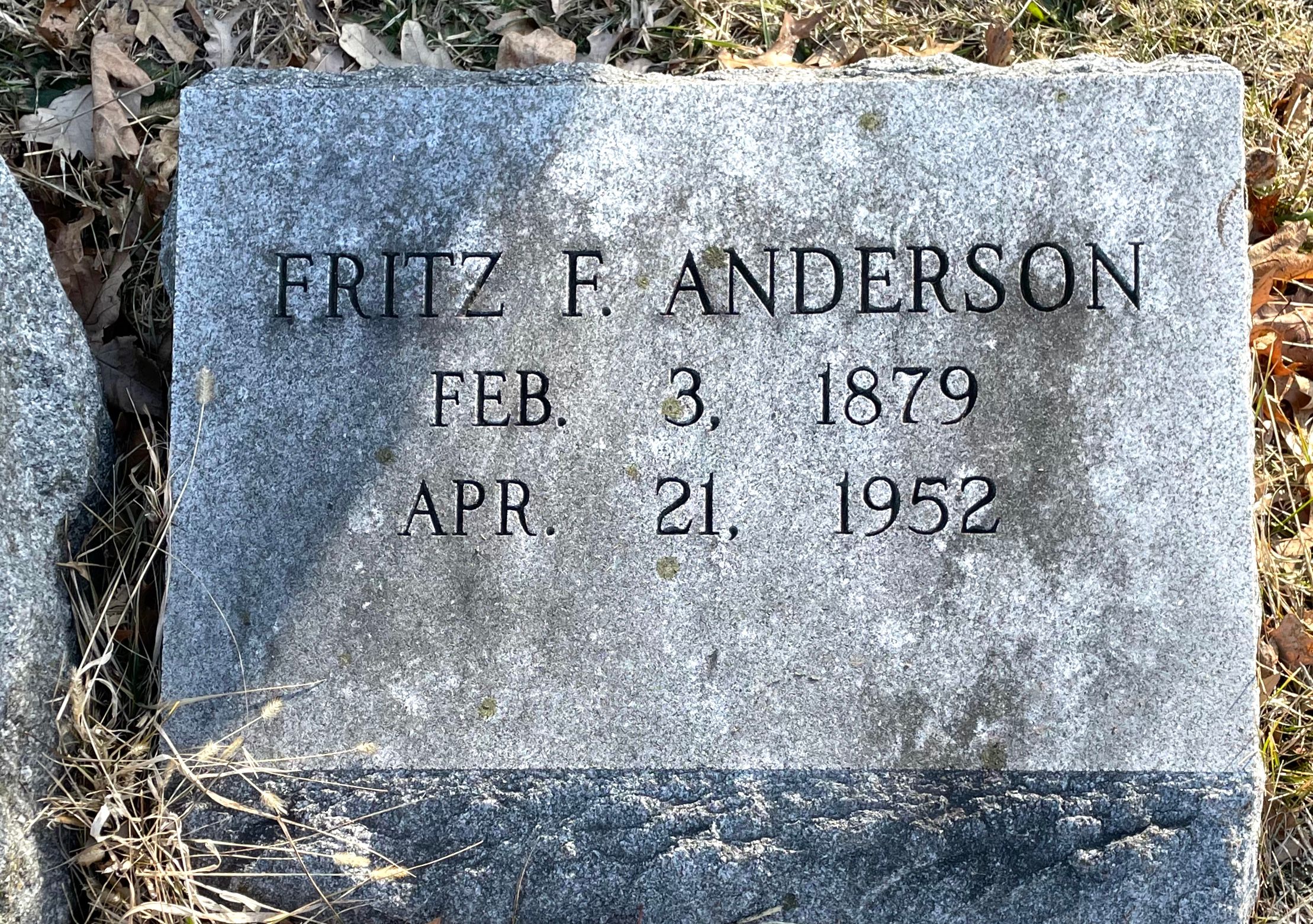 Ferdinand Frithiof "Fritz" Anderson was born on February 3, 1879 in Kisa, Kinda, Östergötland, Sweden. He died on April 21, 1952, at age 73, in Davenport, Scott, Iowa, USA. He was buried in Oakdale Memorial Gardens, Davenport, Iowa.