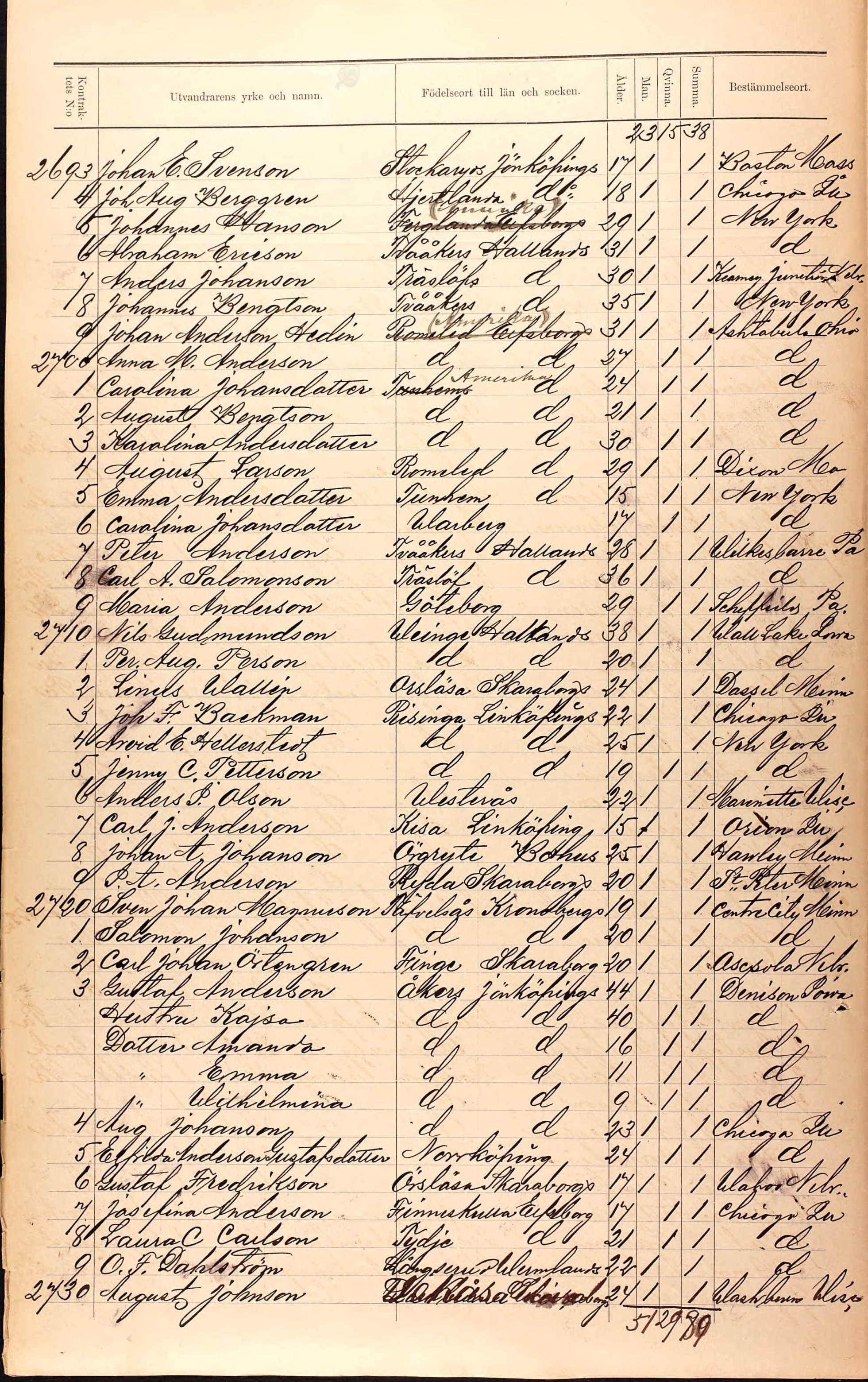 Carl Johan Anderson 1886 Ship Departure Manifest, Line 2717