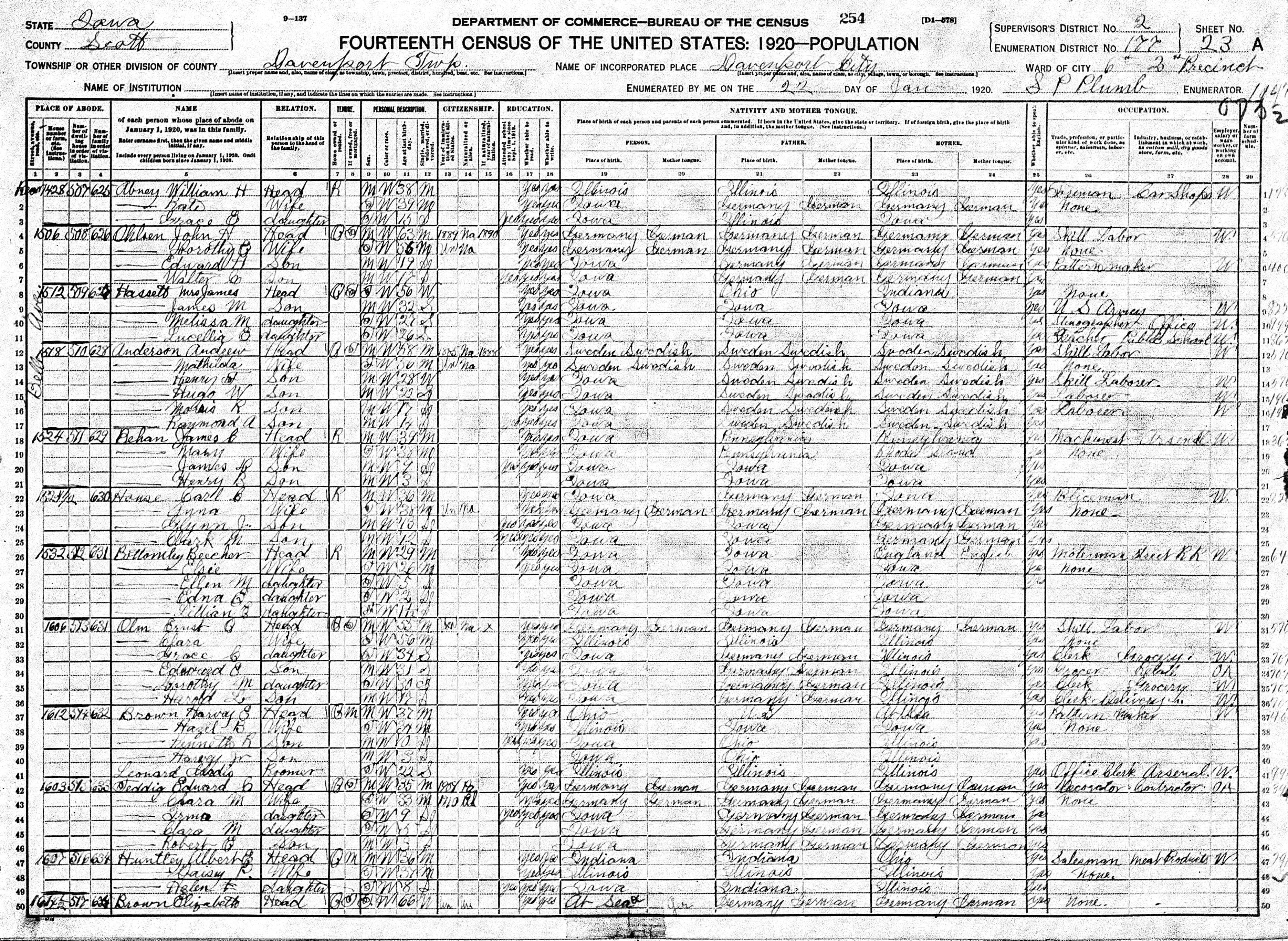 Anderson Family 1920 Federal Census Iowa, Lines 12-17