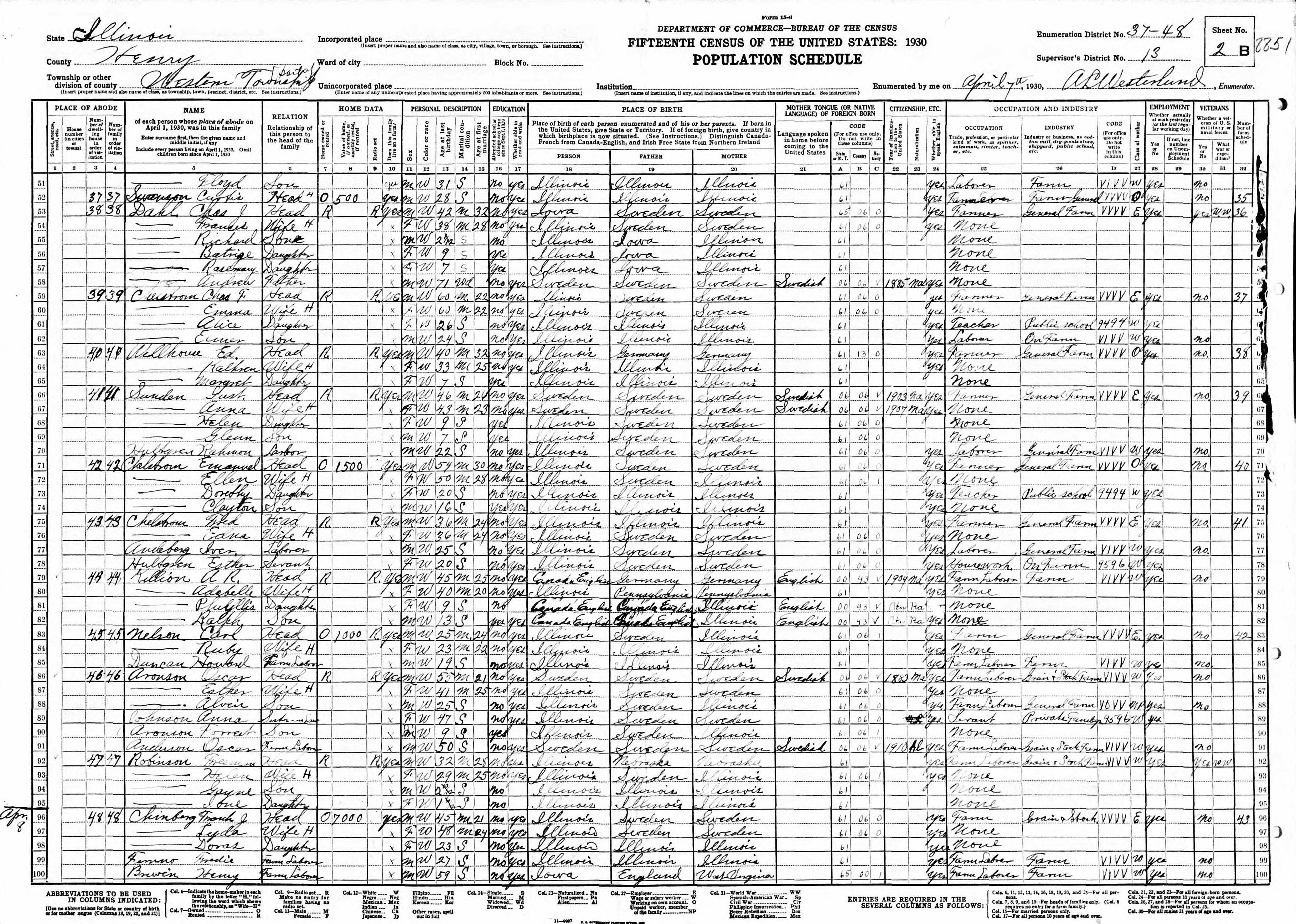Lundell Family 1930 Federal Census Illinois, Lines 36-38