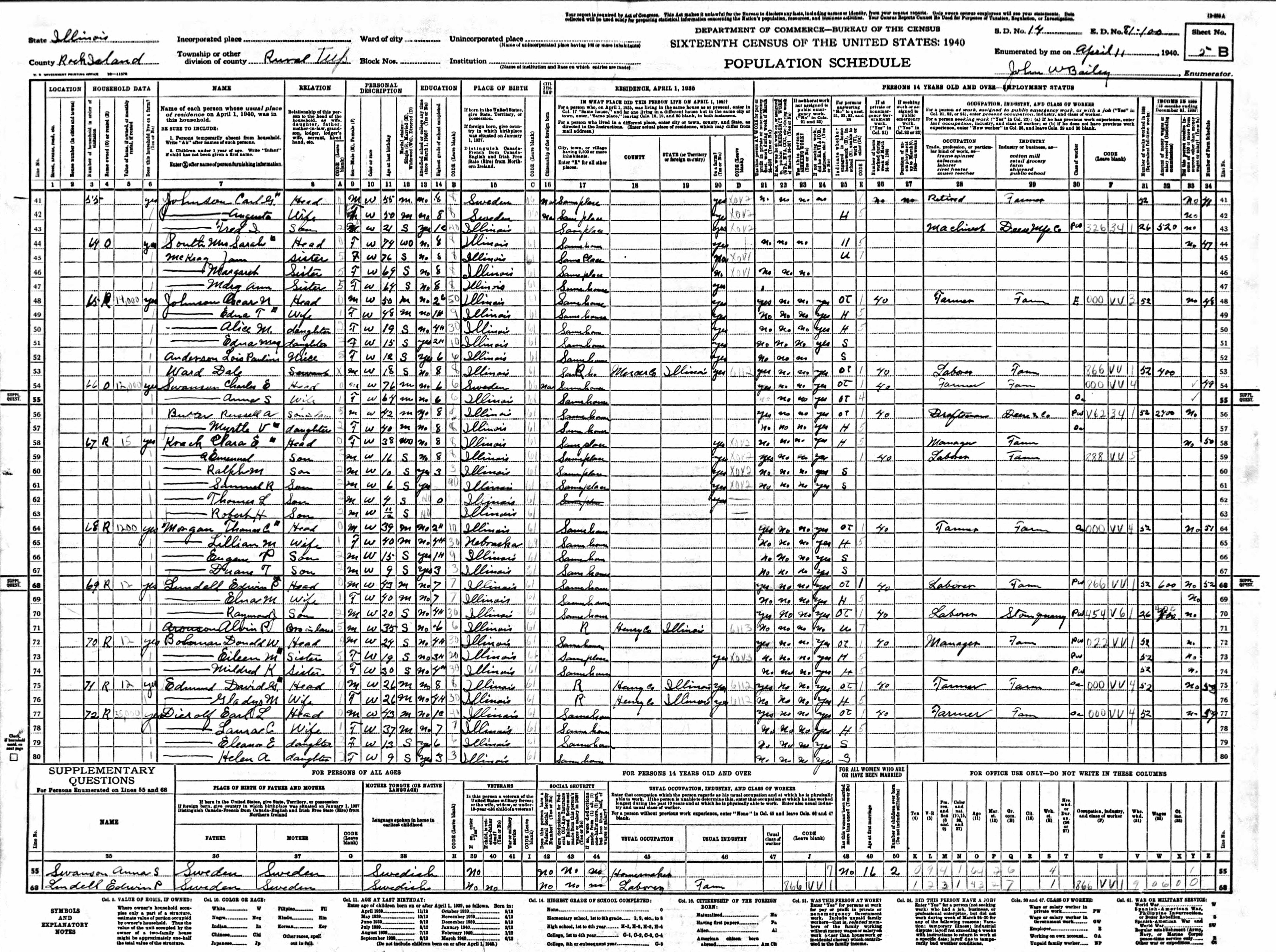 Lundell Family 1940 Federal Census Illinois, Lines 68-70