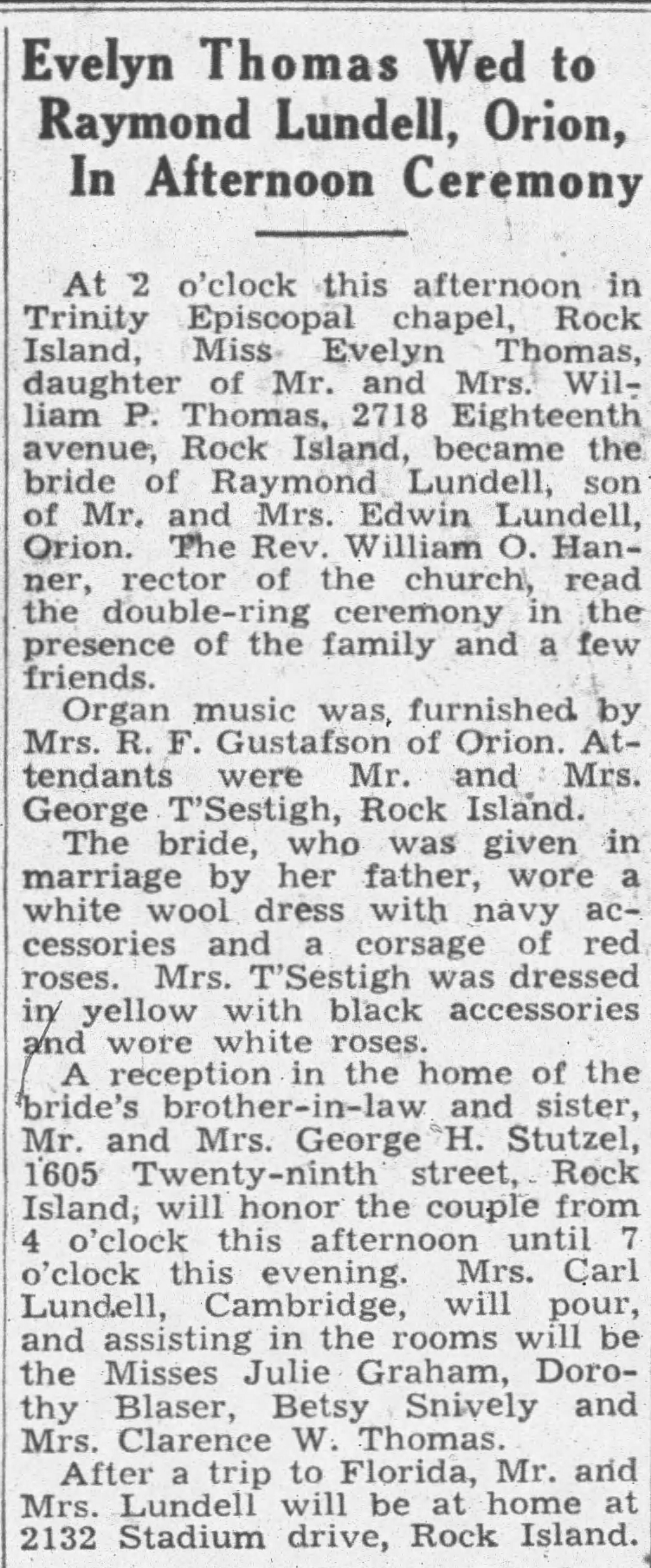 Evelyn Thomas were married on December 12, 1945 in Rock Island, Rock Island, Illinois, USA. He died.