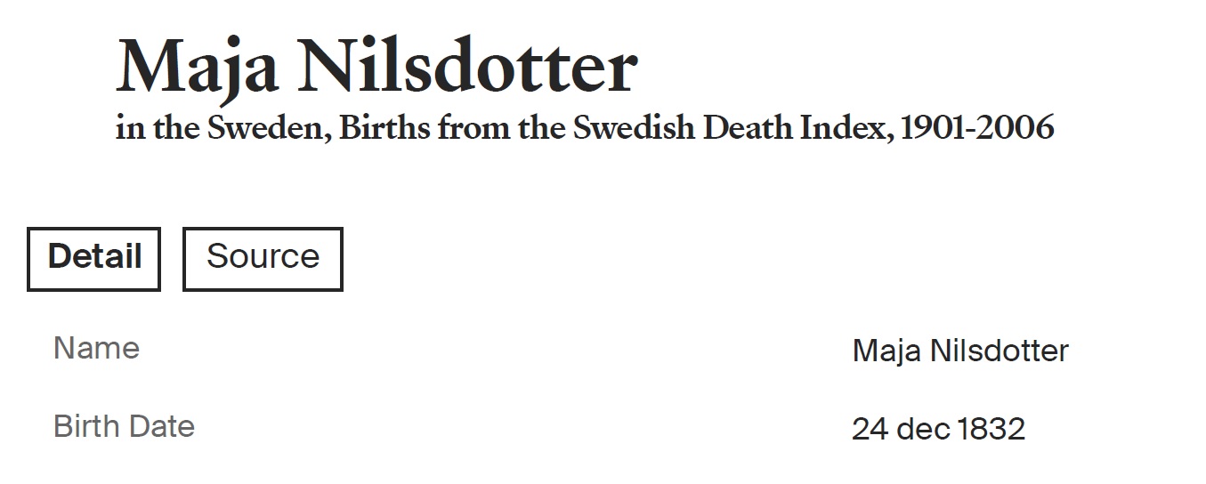 Maja Stina Nilsdotter was born on November 24, 1832 in Gronde, Kisa, Östergötland, Sweden. She and