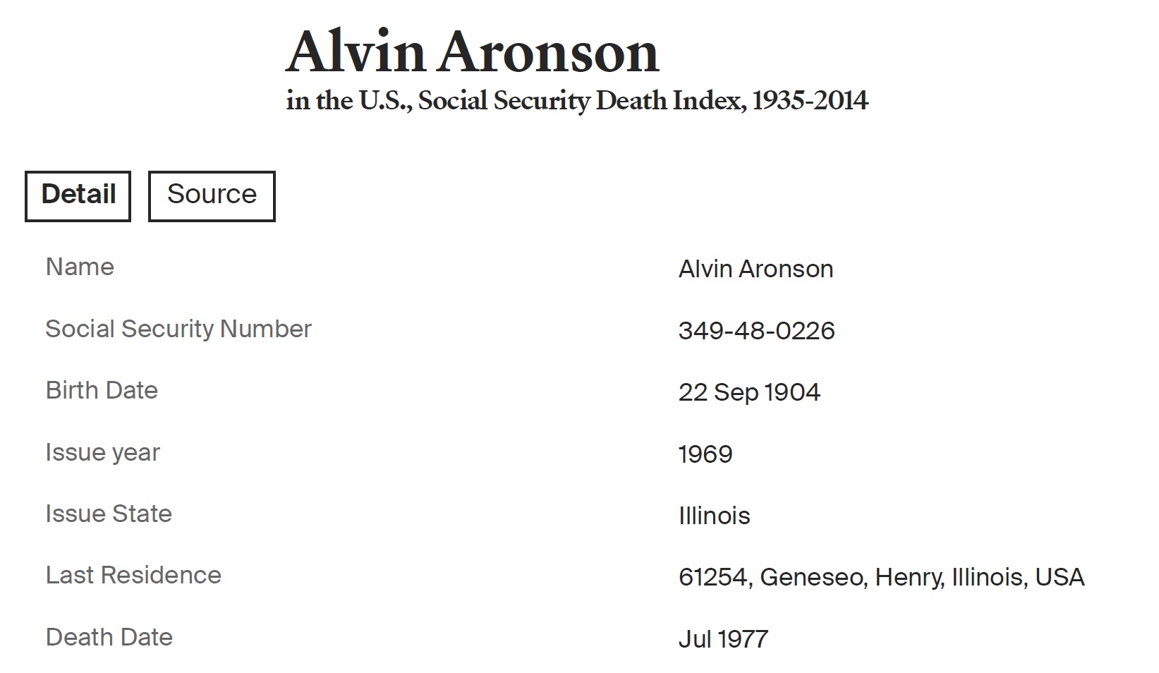 Alvin Petrus Aronson was born on September 22, 1904 in Orion, Henry, Illinois, USA. He died on July 4, 1977, at age 72, in Geneseo, Henry, Illinois, USA. He was buried in Orion Lutheran Cemetery, Orion, Illinois.