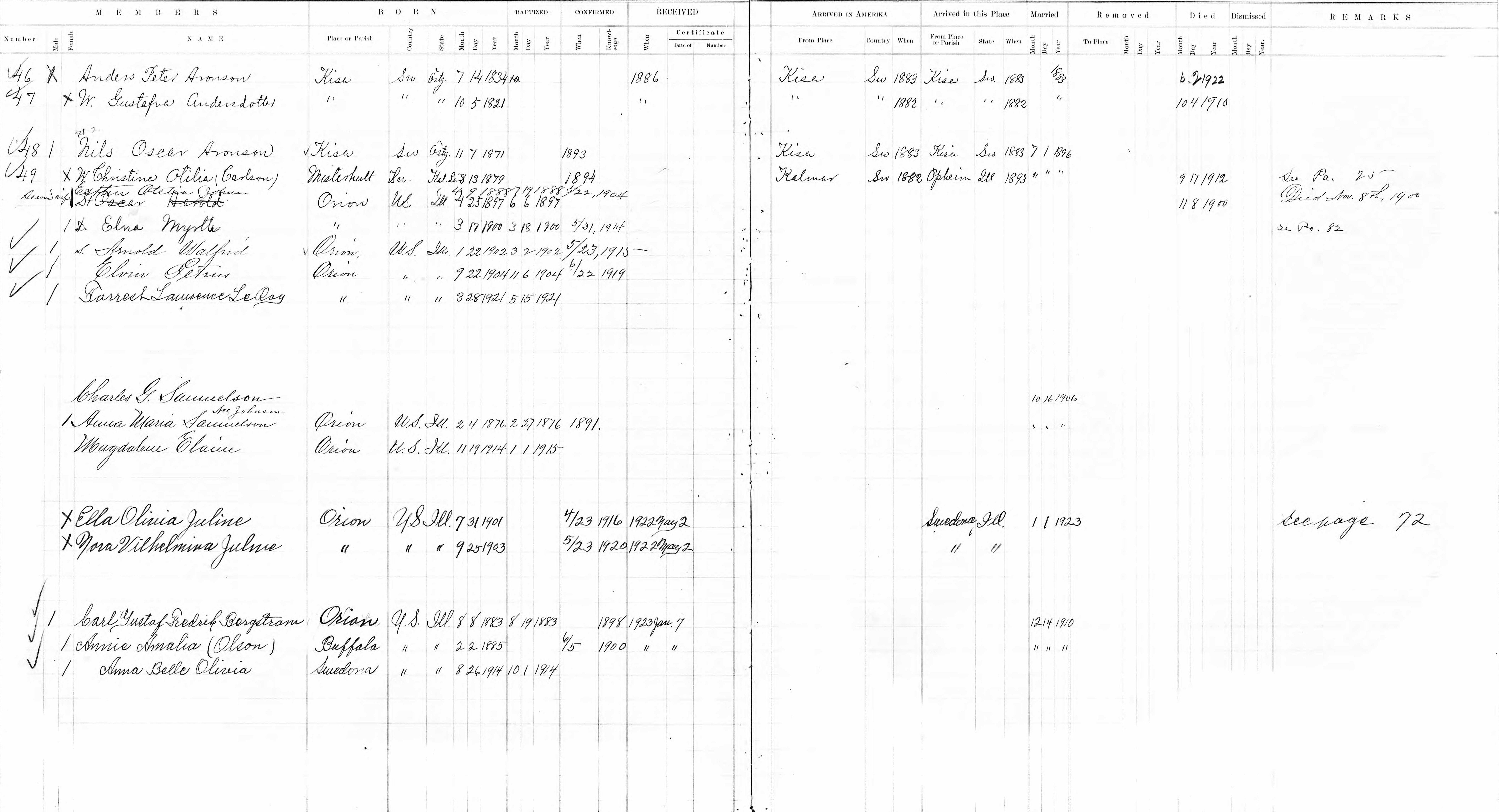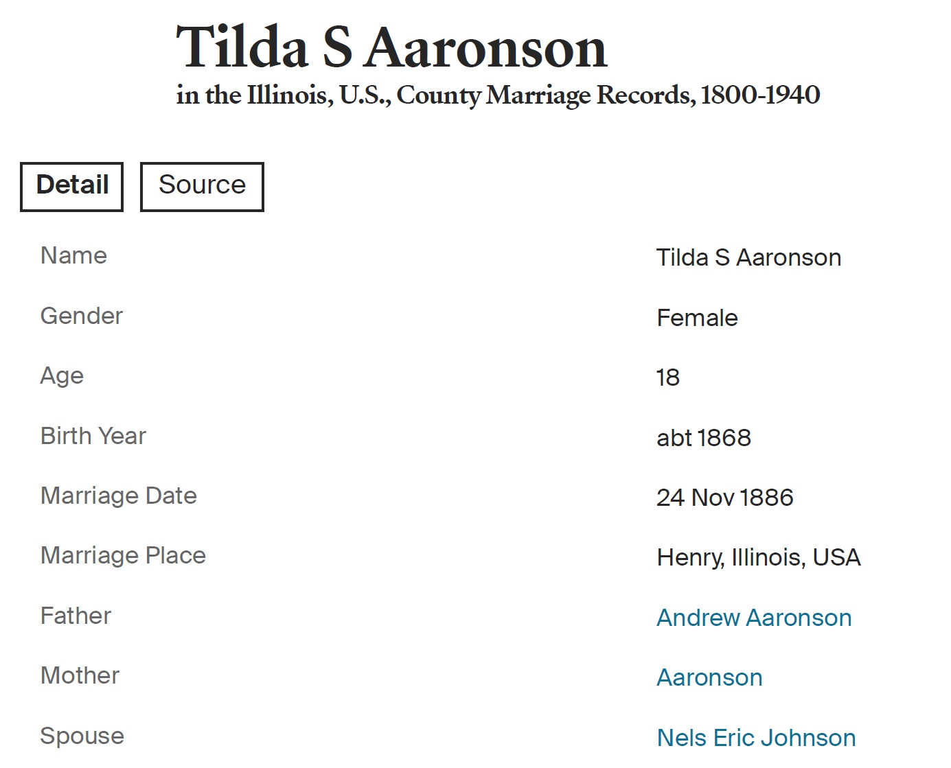 Nils Oscar Aronson were married on May 24, 1913 in Rock Island, Rock Island, Illinois, USA. She died in 1960, at age ~72. She was buried in Orion Lutheran Cemetery, Orion, Illinois.