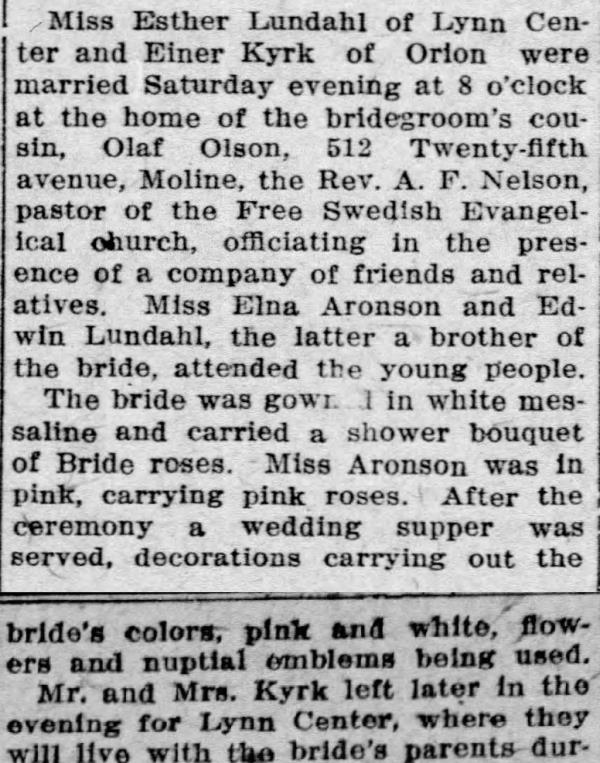 Einer Kyrk were married on December 1, 1917 in Moline, Rock Island, Illinois, USA. She died.
