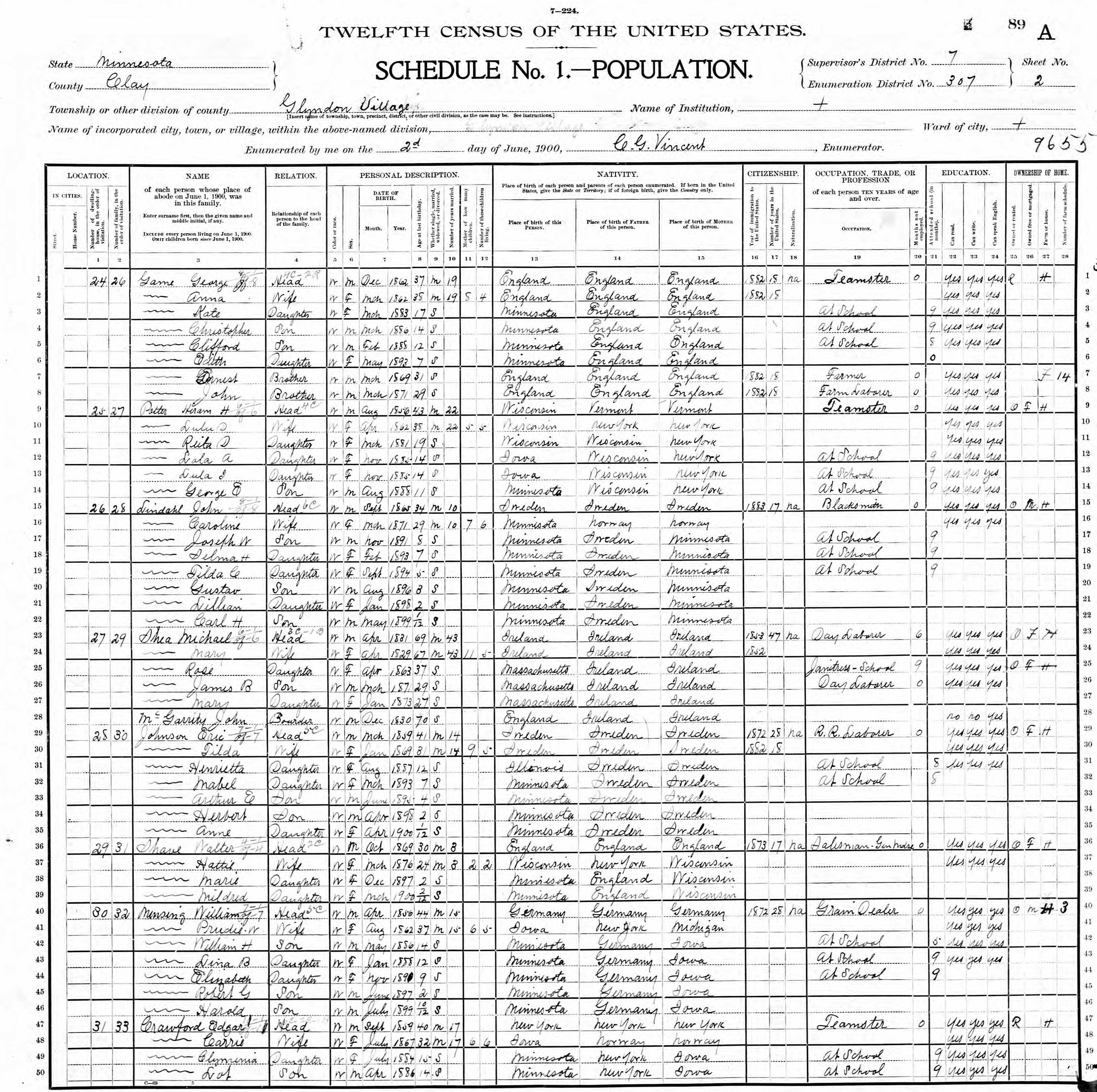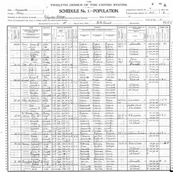 Johnson Family 1900 Federal Census Minnesota, Lines 29-35